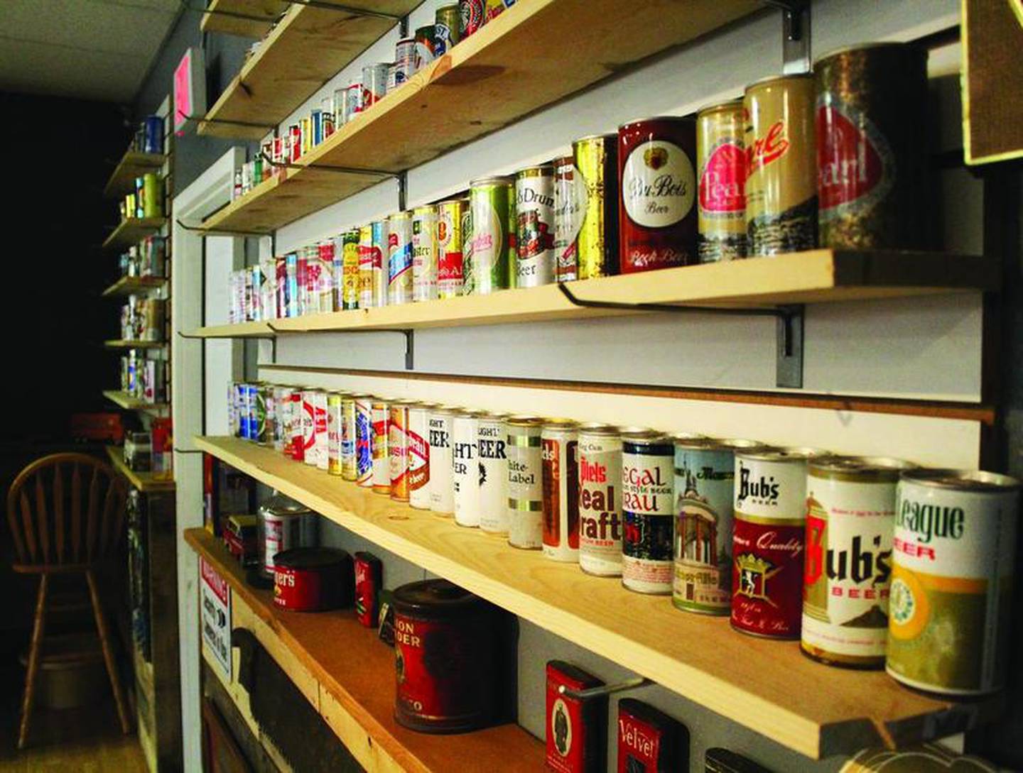 Vintage beer cans line the wall at StoneWood Gaming in Dixon. "Along with entertainment we try to instill some local history and try to give our patrons a nice atmosphere," co-owner Mike Robers said. (Peter Balser)