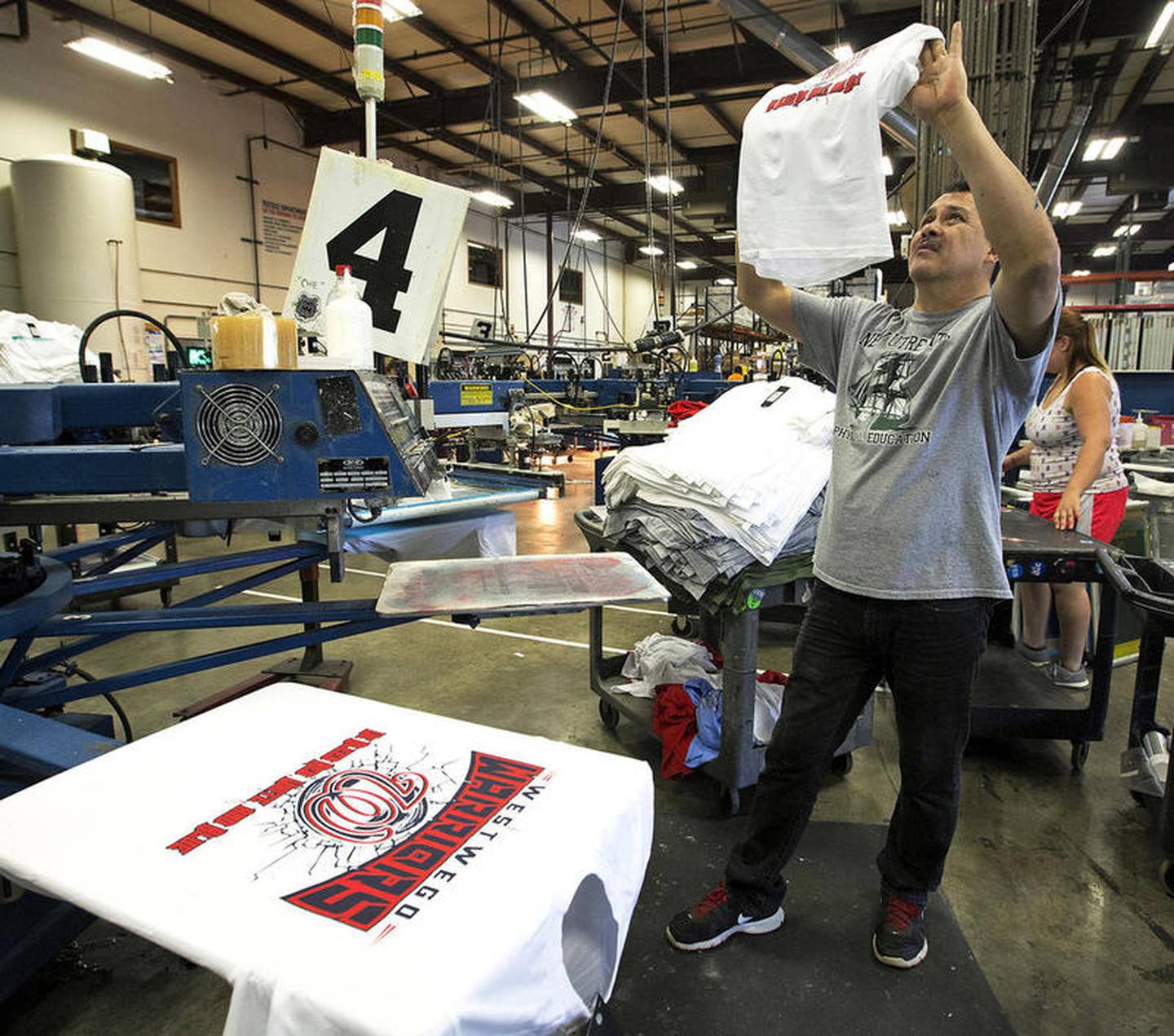 Rodolfo Valencia of Crystal Lake checks a screen-printed shirt May 18 at Sportdecals in Spring Grove. Paul Metivier, Chris Gagnon and Don Metivier recently reacquired the company that serves more than 10,000 high schools, colleges, clubs and organizations through the sale of custom team uniforms, spirit wear and decals. John Konstantaras for Shaw Media (John Konstantaras)