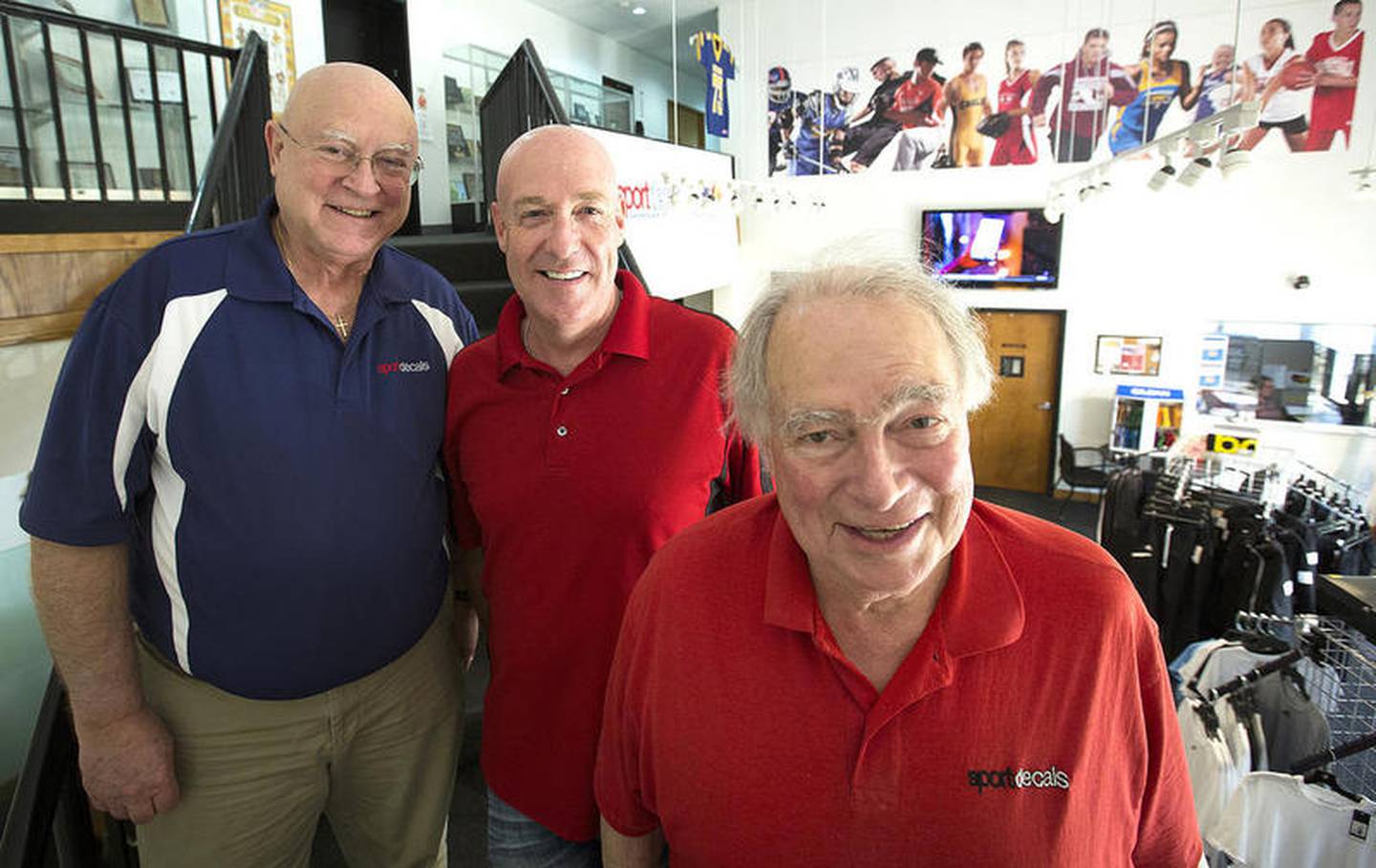 John Konstantaras for Shaw Media Sportdecals co-owners Paul Metivier (from left), Chris Gagnon and Don Metivier pose for a photo May 18 at Sport Decals in Spring Grove. Don Metivier founded the company 50 years ago, and they recently reacquired the company that serves more than 10,000 high schools, colleges, clubs and organizations through the sale of custom team uniforms, spirit wear and decals. (John Konstantaras)