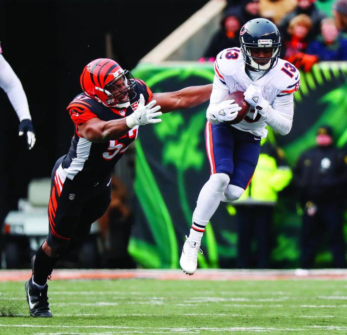 The Bears’ Kendall Wright (13) catches the ball in front of the Bengals’ Vincent Rey (57) on Sunday in Cincinnati. (Jose M)