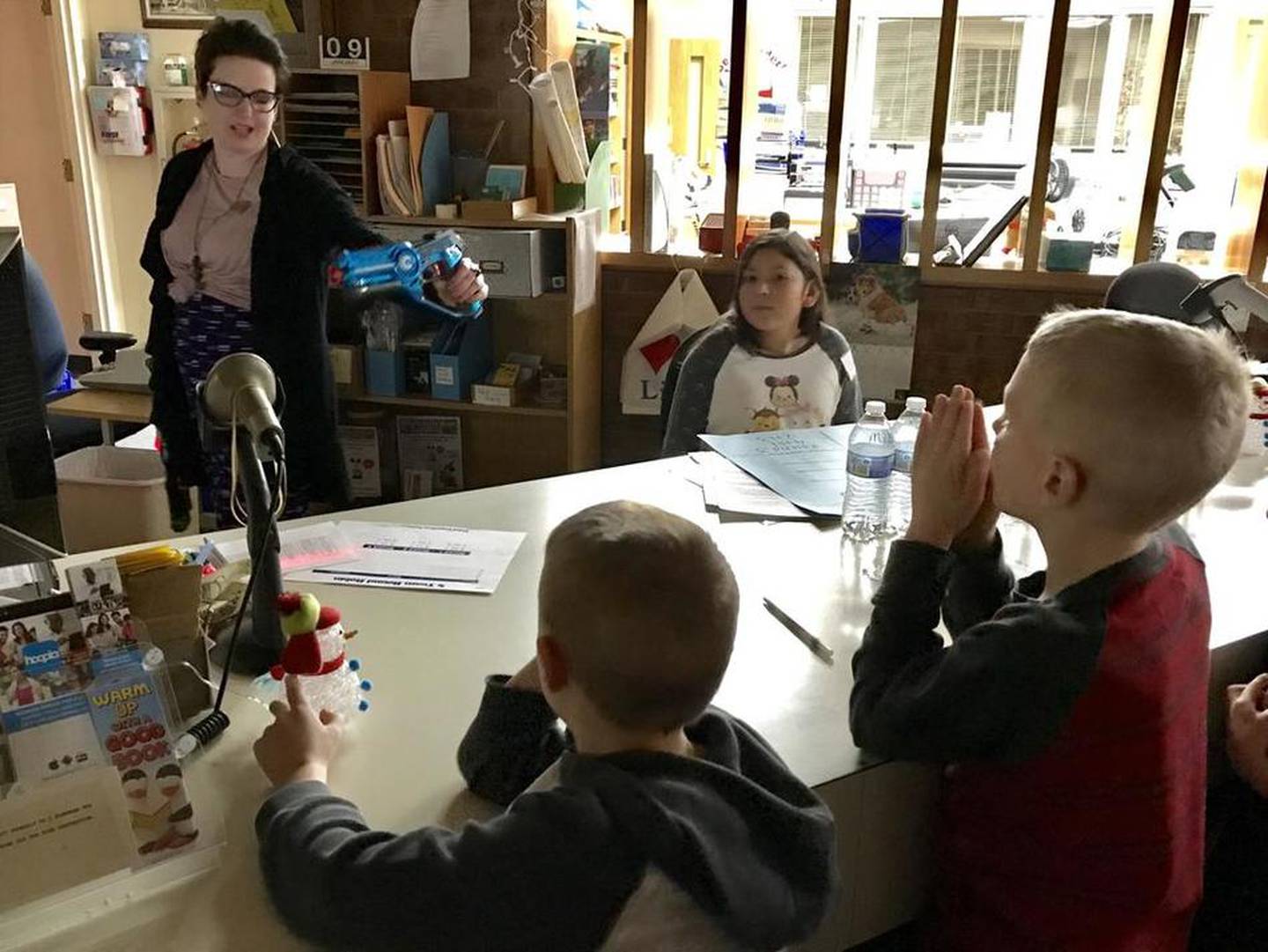Youth services employee Anita Rowold describes how to use the new laser tag guns at the Three Rivers Public Library family laser tag night Sunday in Channahon. Joshua Witcofski (left) and his brother Zachary listen to the rules before heading out to the book stacks.