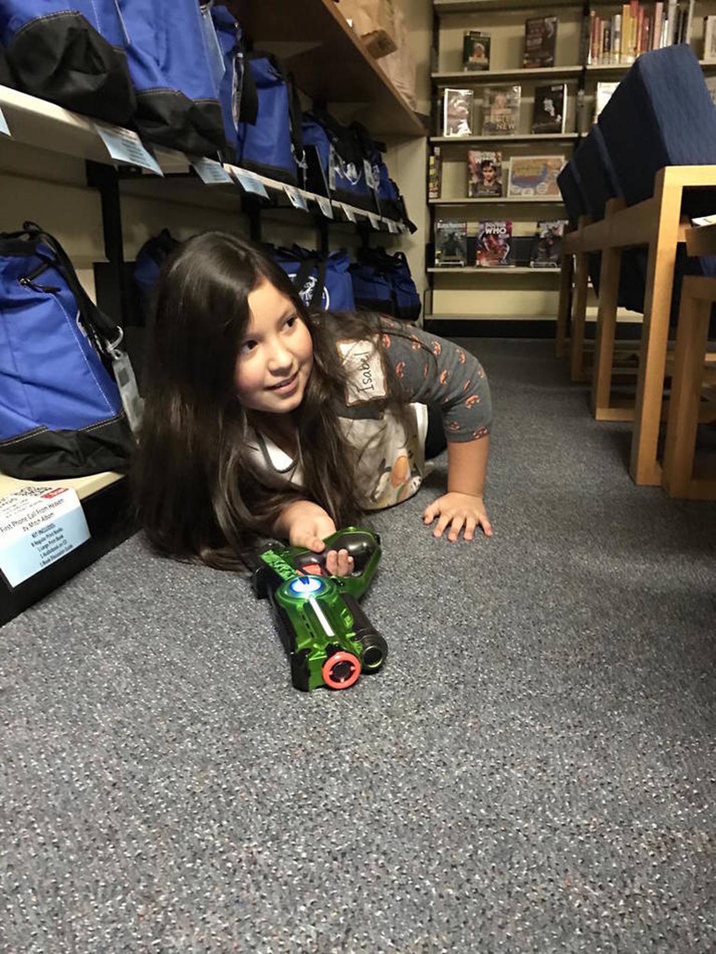 Seasoned laser tag player Isabel Sanchez-Lyons, crawls through the chairs at the Three Rivers Public Library in Channahon on Sunday during family laser tag night. Her strategy was to stay low and out of plain sight.