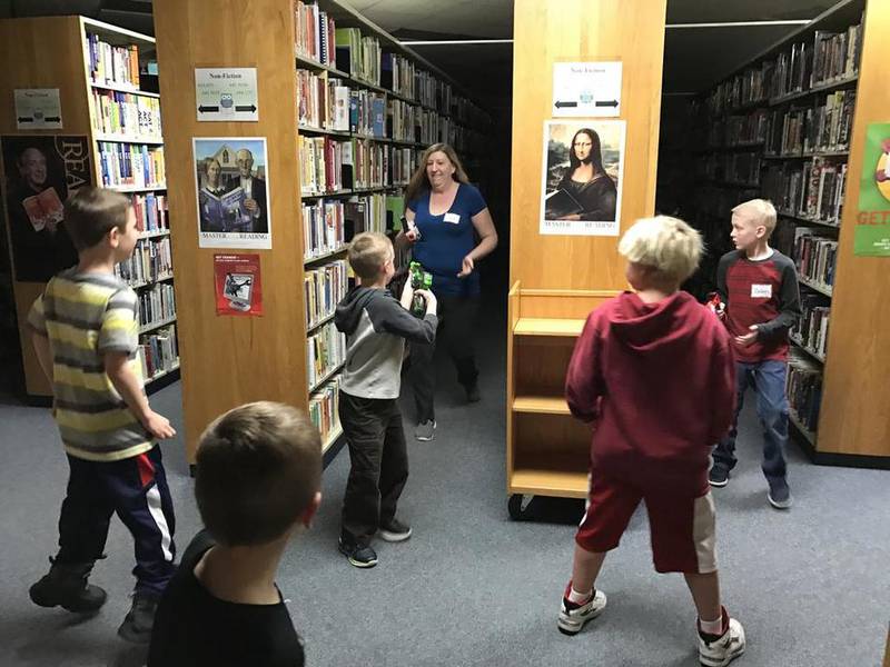 Three Rivers Public Library District-Minooka Branch circulation clerk Jennifer Lyons (center) gets shot by Joshua Witcofski, 7, of Minooka at the family laser tag night Sunday at the library. (ALLISON Selk)