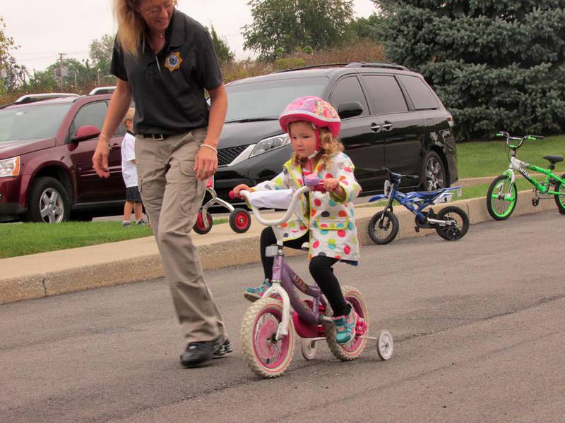 DeKalb County Sheriff's Deputy Misty Odom leads her daughter, Payton, 2, through the third annual Trike-A-Thon on Friday at Walnut Street Daycare in Genoa. Odom helped teach the children at the day care about bicycle and tricycle safety in preparation for the event. (Stephanie Markham)