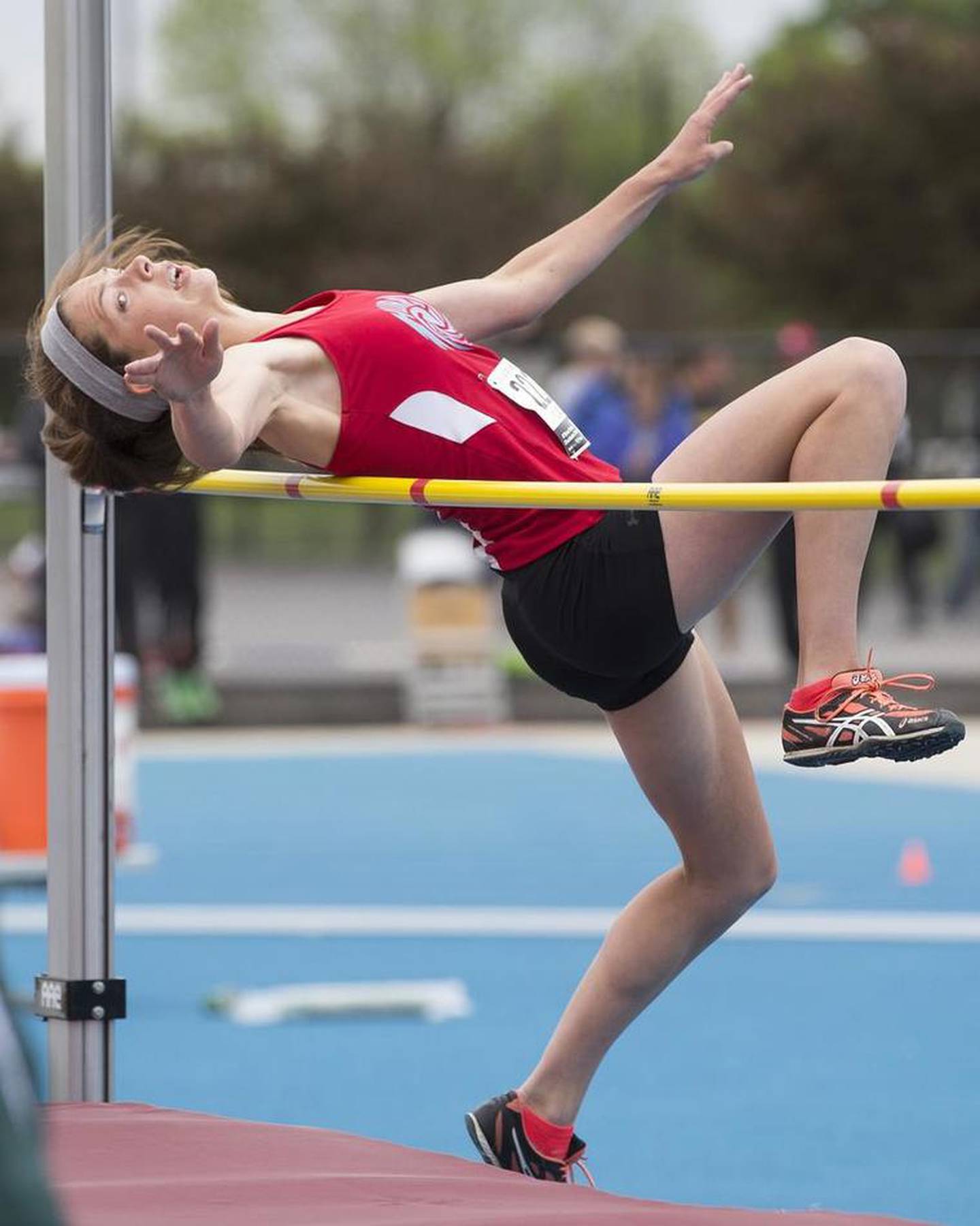Marian Central's Eve Meintz competes in the high jump preliminary competition Friday at the state meet in Charleston. Meintz qualified for Saturday's finals. (Douglas Cottle)