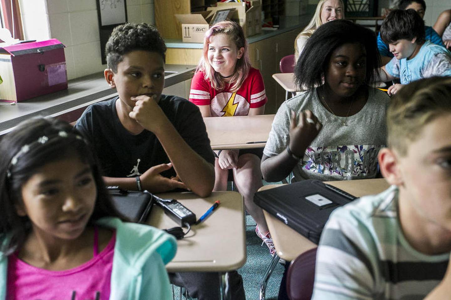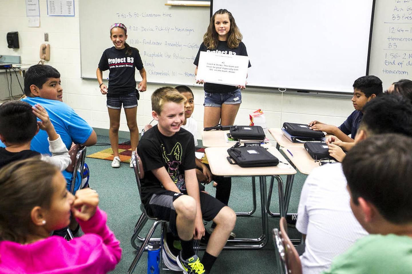 Sarah Nader - snader@shawmedia.com Seventh-grade student Sam Tanner (center), 12, listens to a presentation from eight-grade students for the Project B3 program at Hannah Beardsley Middle School in Crystal Lake Monday, August 29, 2016. Project B3 is a program for elementary and middle school students that starts a conversation about digital responsibility as students start to become more active online. (Sarah Nader)