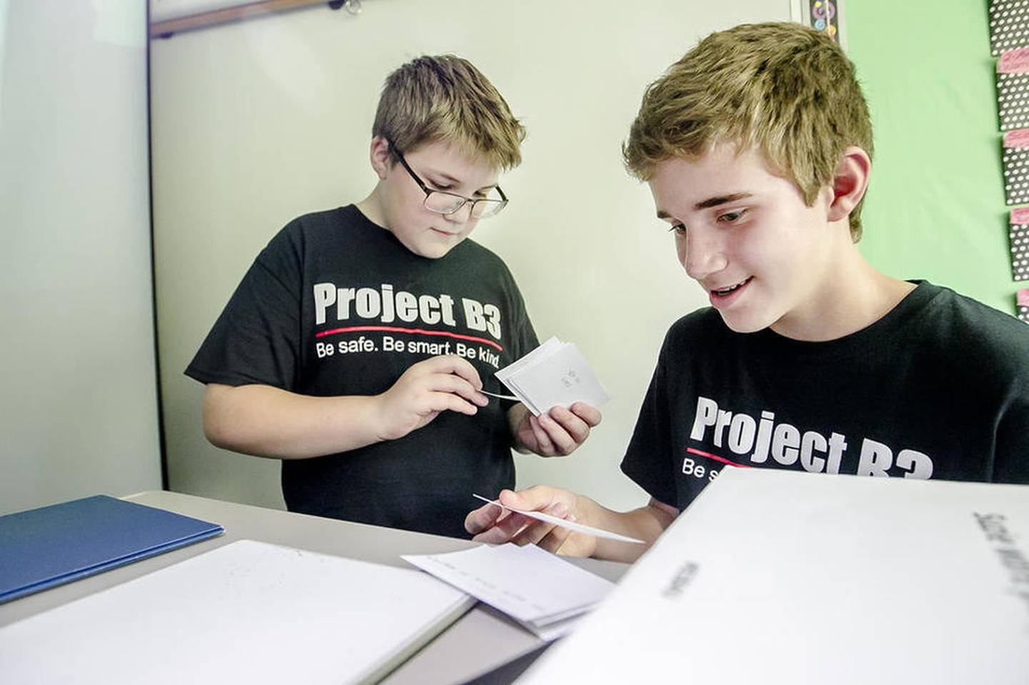 Sarah Nader - snader@shawmedia.com Eight-grade students Keaton Asbach (left), 13, and Sam Baser, 13, talk to seventh-grade students about the best way to respond to different situations while speaking to students for the Project B3 program at Hannah Beardsley Middle School in Crystal Lake Monday, August 29, 2016. Project B3 is a program for elementary and middle school students that starts a conversation about digital responsibility as students start to become more active online. (Sarah Nader)