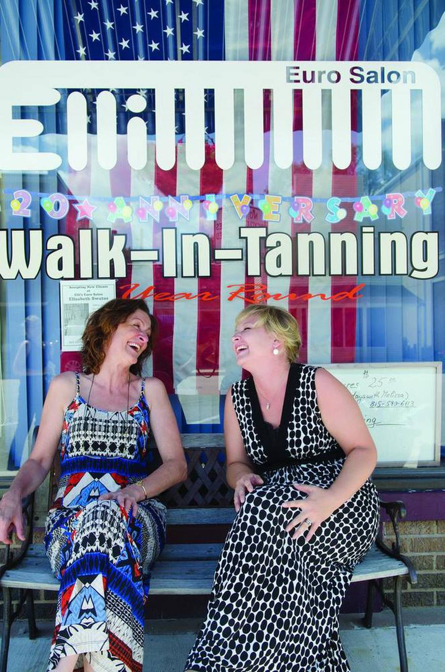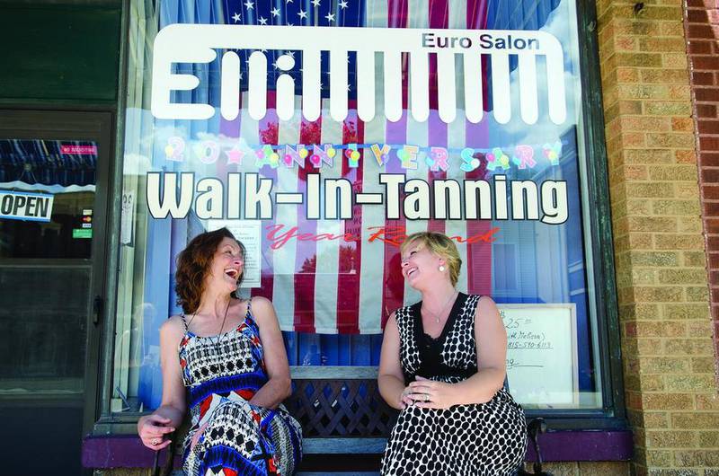 Elli’s Euro Salon owner Elisabeth Woolums (left) and hairdresser Elizabeth Swatos share a laugh outside the downtown Prophetstown salon. (Philip Marruffo)