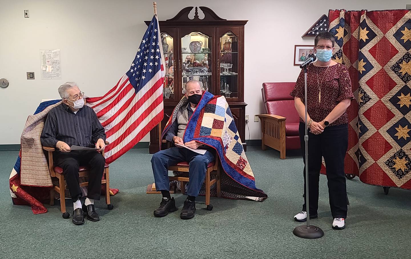 Rev. Ed Harkrader (left) and Marvin Dabler (right), both residents of Greenfield Retirement Home, were each presented a Quilt of Valor by Terry Johnson on Tuesday to honor and thank them for their military service. A ceremony was held at Greenfield Retirement Home in time for this week's Veterans Day recognition. (Kim Shute)