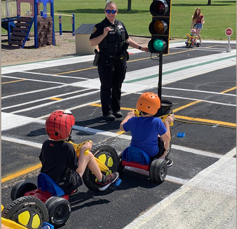Students act as pedestrians and ride Big Wheels bikes through the town to learn about safety as a pedestrian and rules of the road for bicyclists.