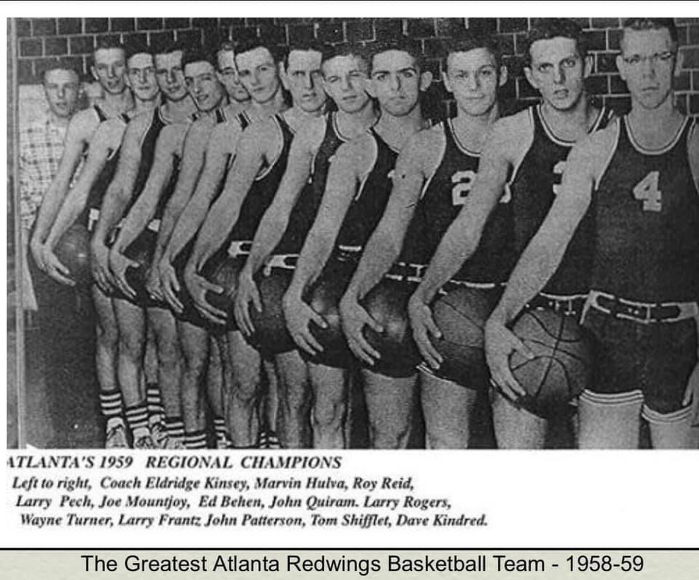Dave, who is 17 years older than Randy, and 20 than Kip and I, was point guard for the hometown Atlanta’s Redwings 1959 undefeated regional champion basketball team, which defeated neighboring giant Lincoln. He went on to play baseball for Illinois Wesleyan University.