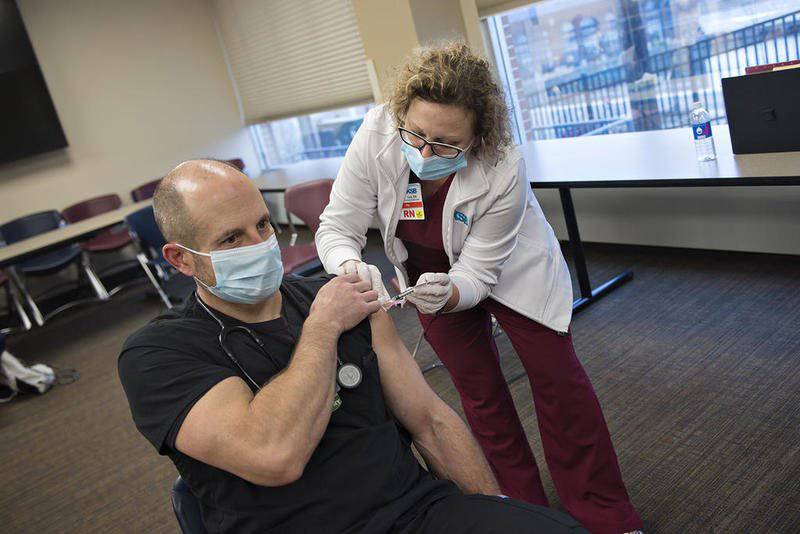 Respiratory therapist Jeremy Toms was the first to receive a COVID-19 vaccination, and employee health nurse Cam Peterson said they plan to vaccinate 10 to 12 employees every hour until they’ve used all the doses.