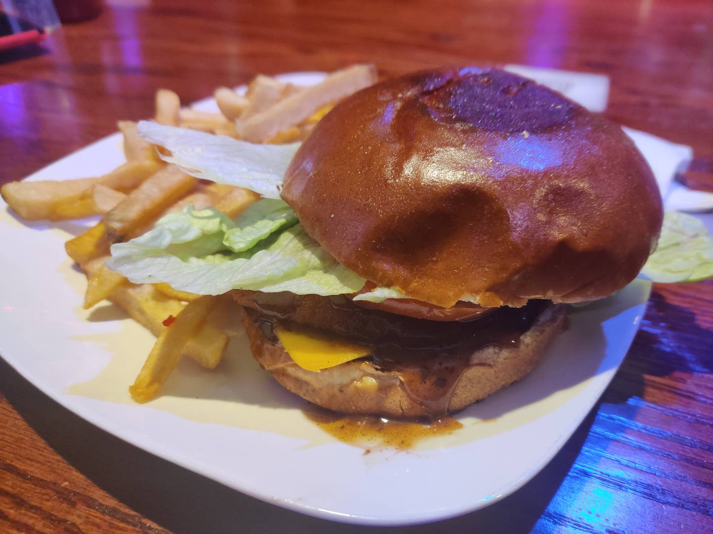 And the order snafu turned out to be a blessing. One of the young eaters wanted a burger, but the jerk chicken sandwich was brought instead. After the long wait, he didn’t want to send it back, but his grumpy disposition turned positive as soon as he bit into it. The breaded chicken patty was thin and crispy, buried under the jerk sauce on a beautifully toasted bun.