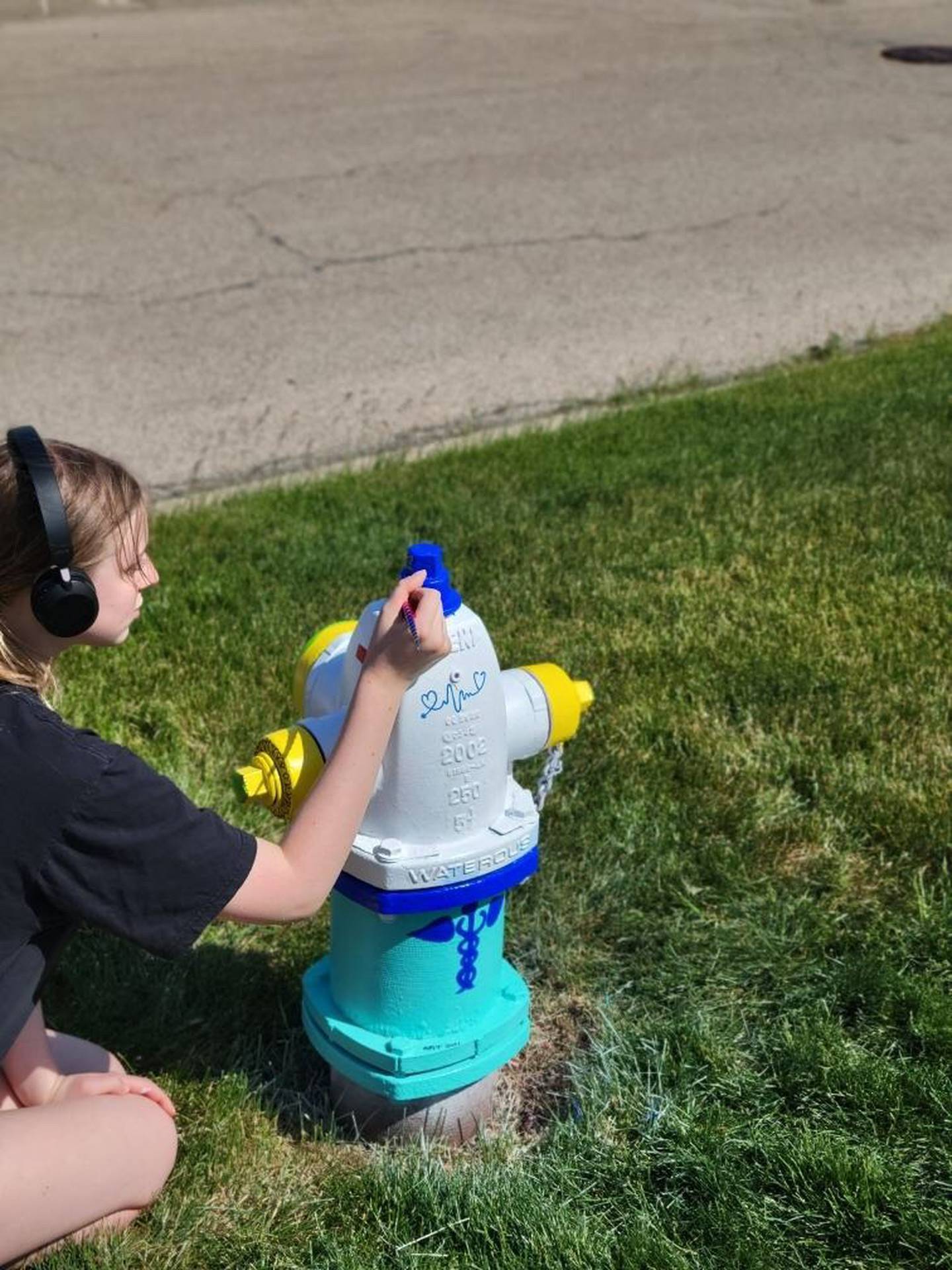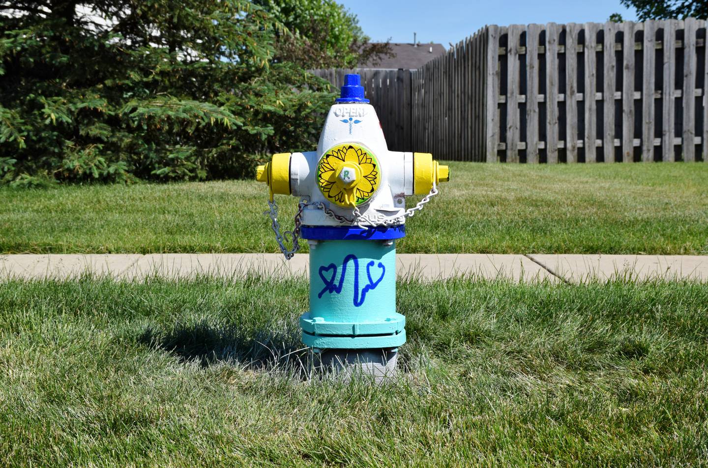 On the grass between the Terry home and the Petersen home off of Settler Road and Horizon Lane sits the result: A white, blue and yellow fire hydrant painted with a Red Cross nurse symbol, an electrocardiogram heart scan with literal hearts, and sunflowers with the letter ‘R’ inscribed in the middle. They were Rachel’s favorite flowers, Terry said.