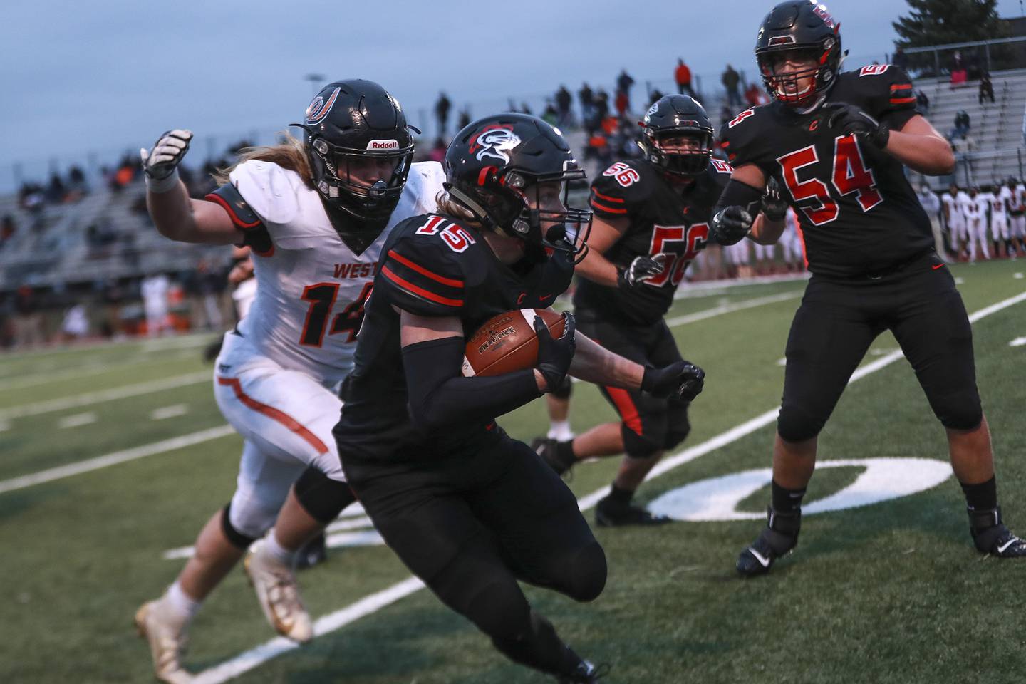 Central quarterback Turner Doran and running back Ethan Rossow connected all game long and two times on the final drive, getting the Knights to the Warriors’ 37-yard line, but West stiffened. After a short gain on second down, Doran was able to keep plays alive but couldn’t connect with his receivers on third and fourth down.