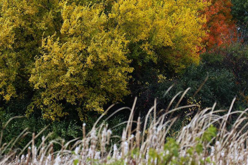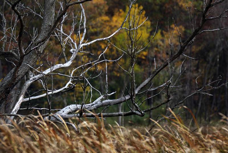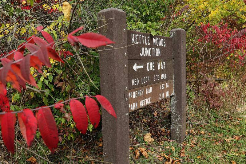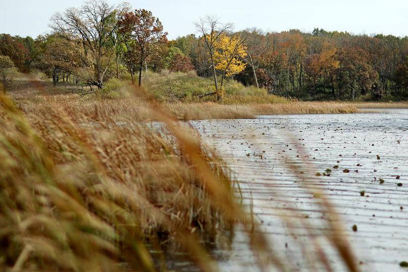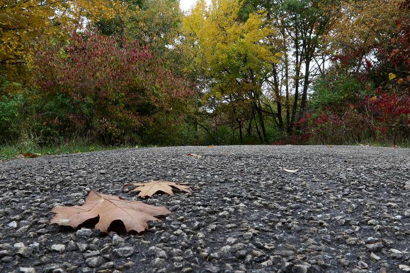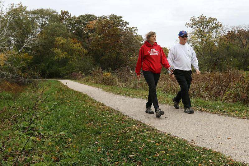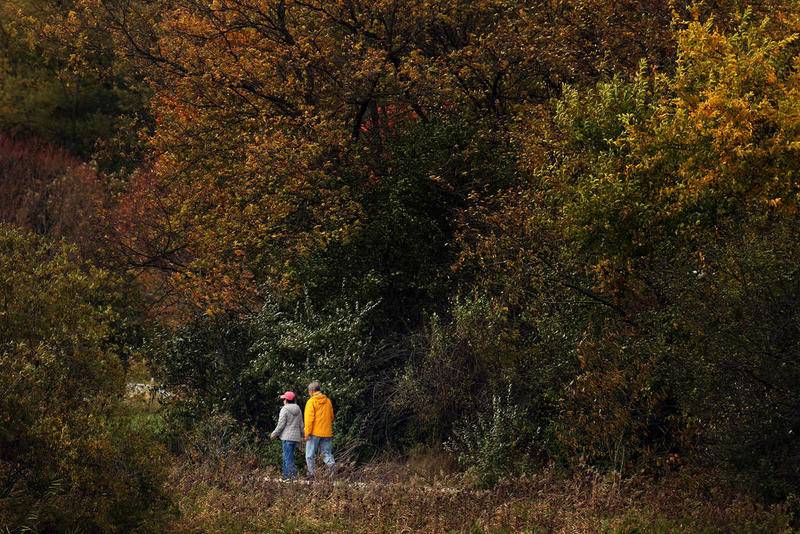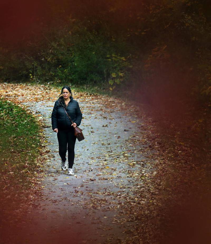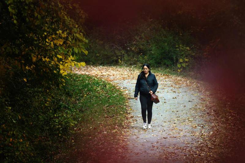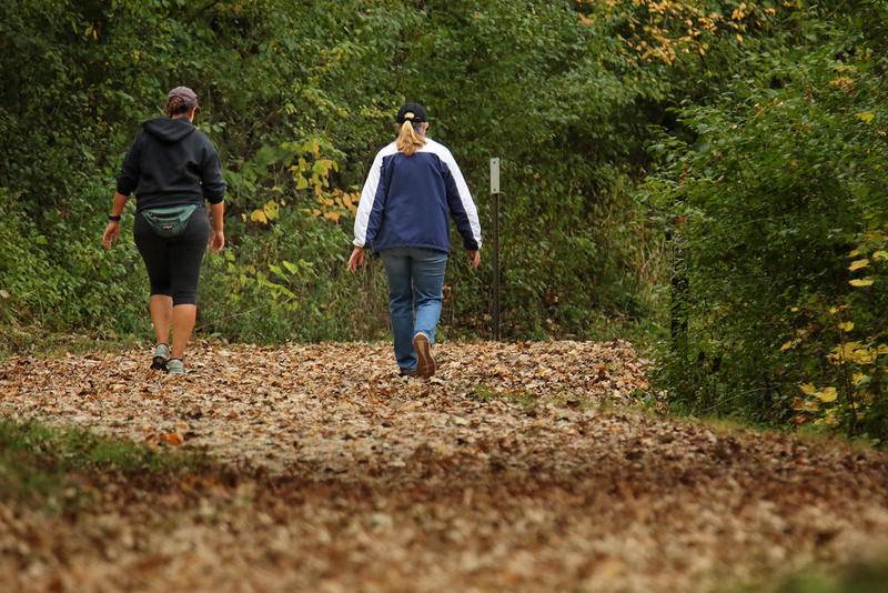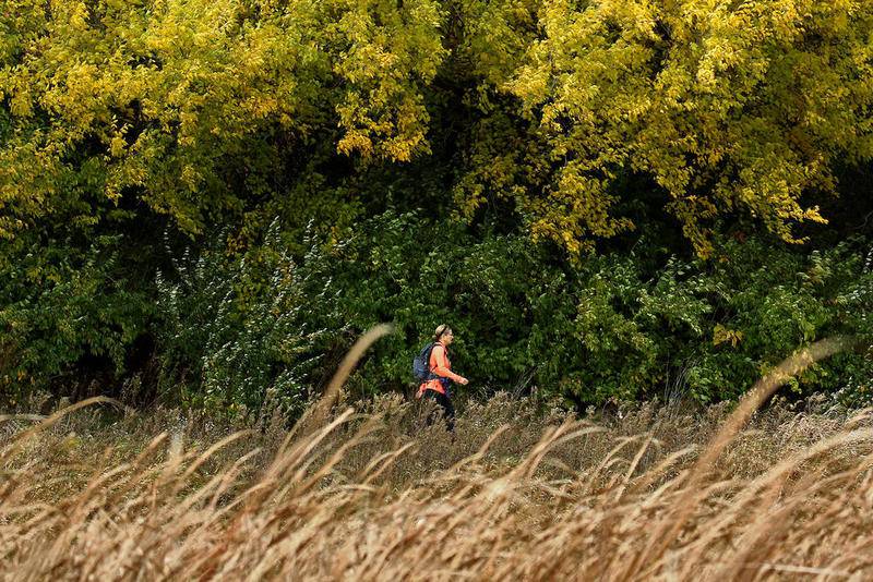 Deanne Stacey of Wauconda walks through the fallen leaves and changing foliage at Moraine Hills State Park on Wednesday, Oct. 14, 2020 in McHenry. (Matthew Apgar)