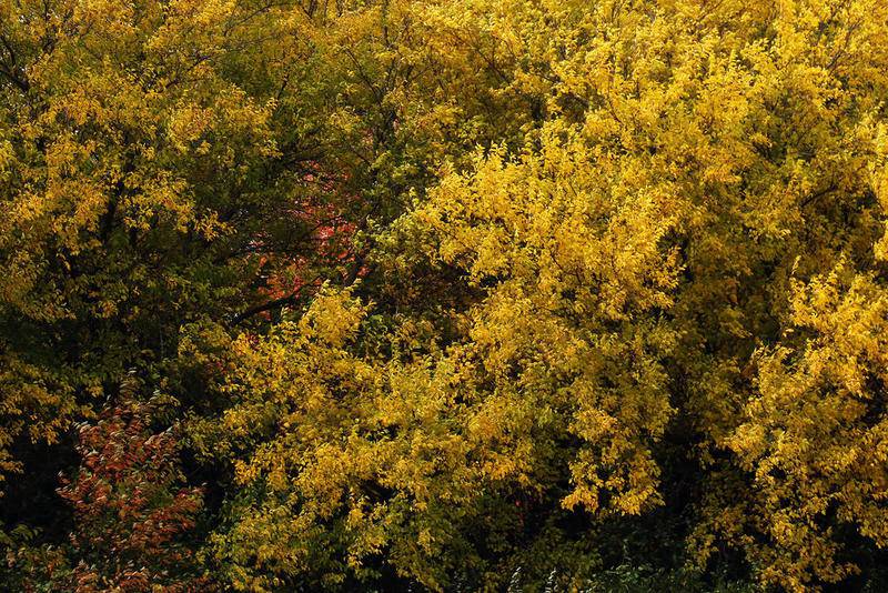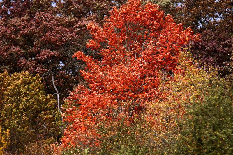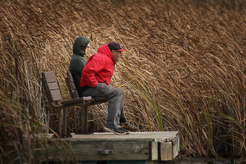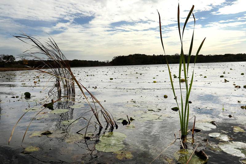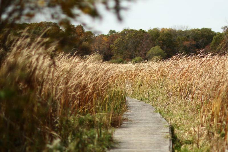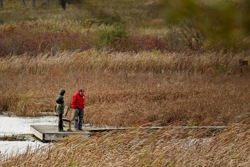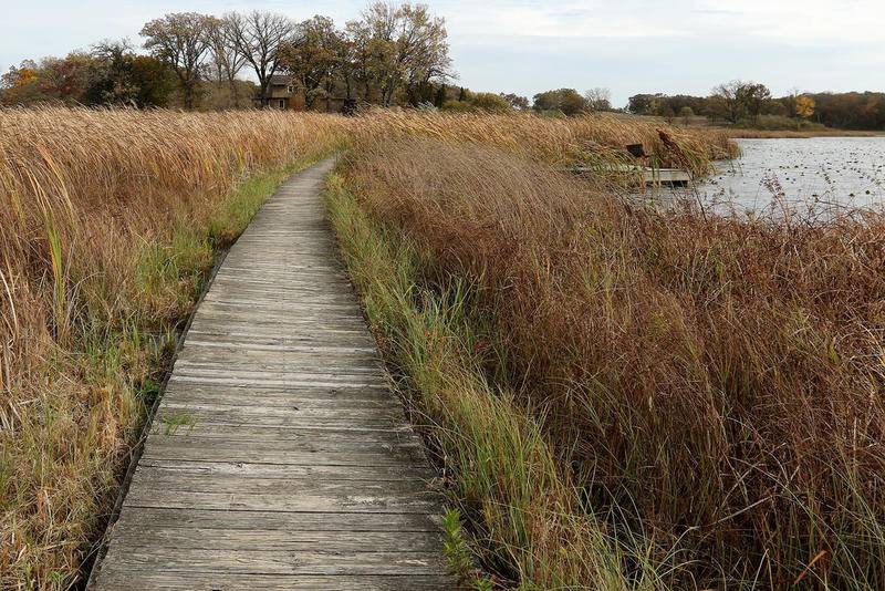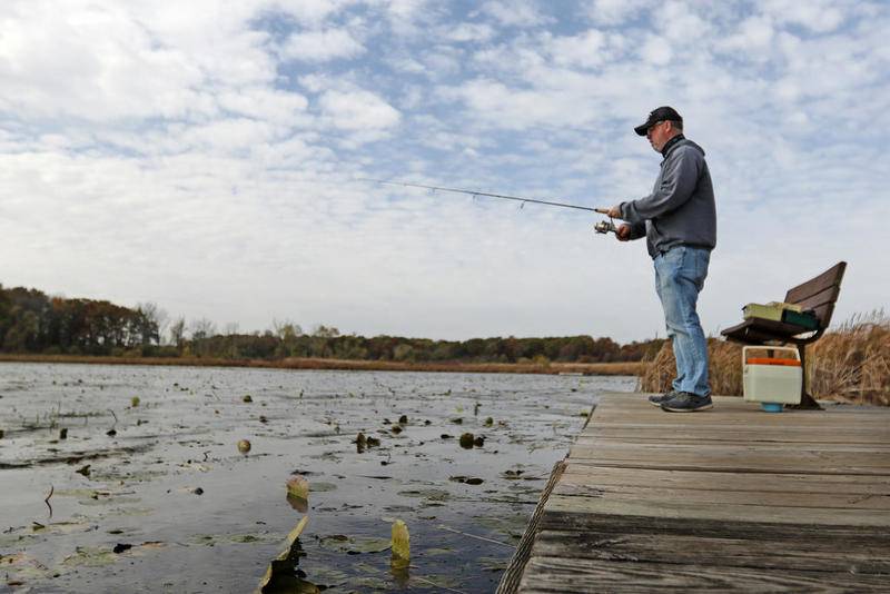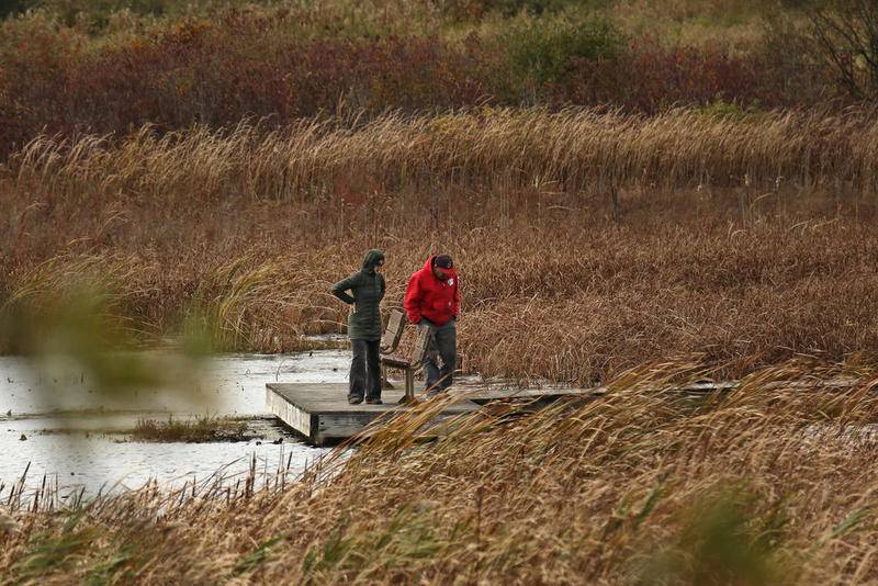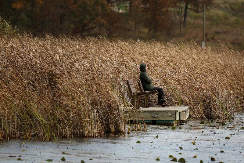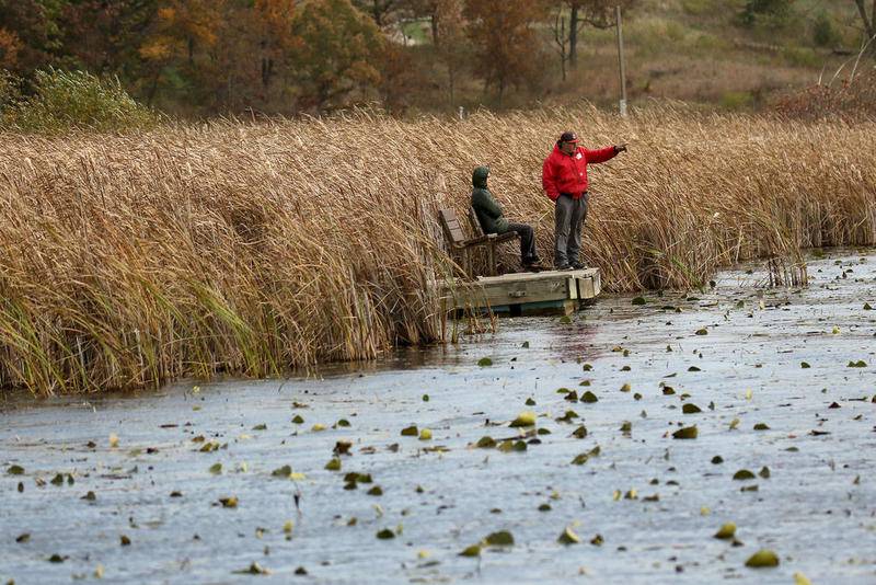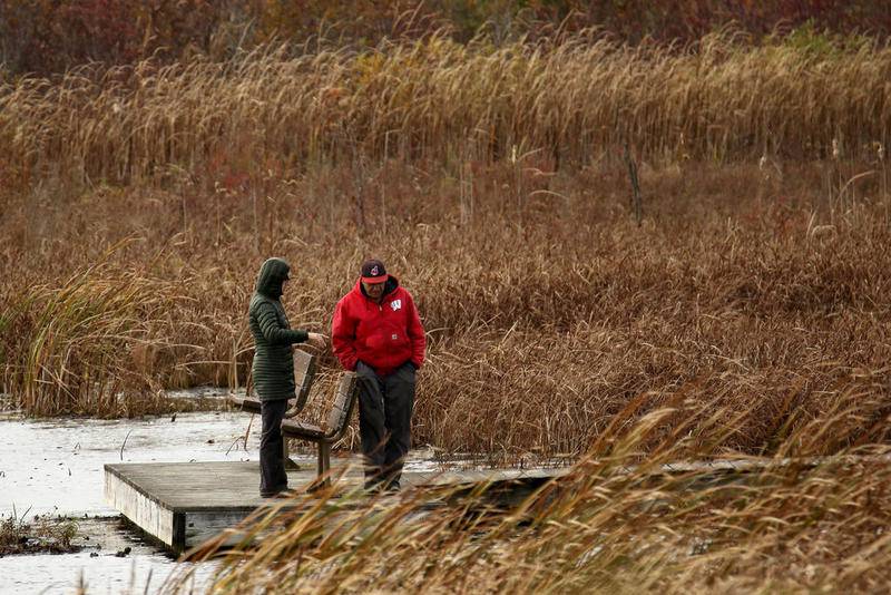 Deanne Stacey of Wauconda walks through the fallen leaves and changing foliage at Moraine Hills State Park on Wednesday, Oct. 14, 2020 in McHenry. (Matthew Apgar)