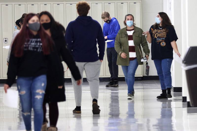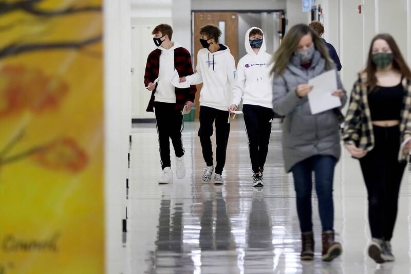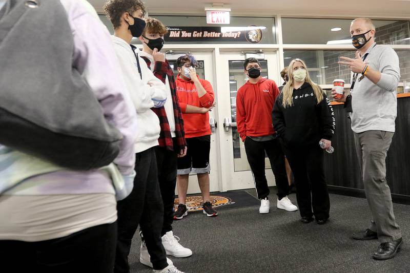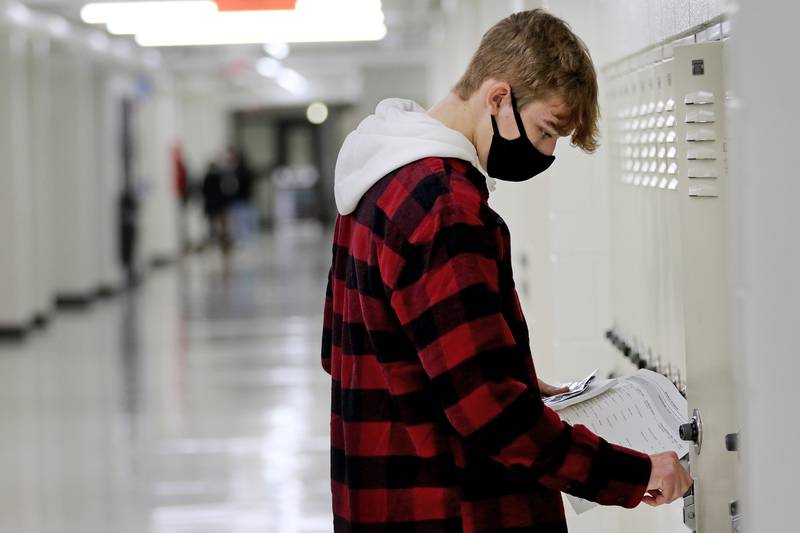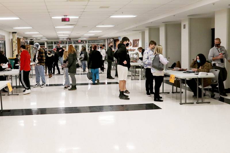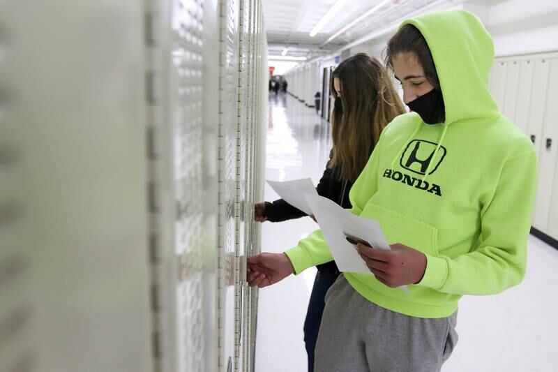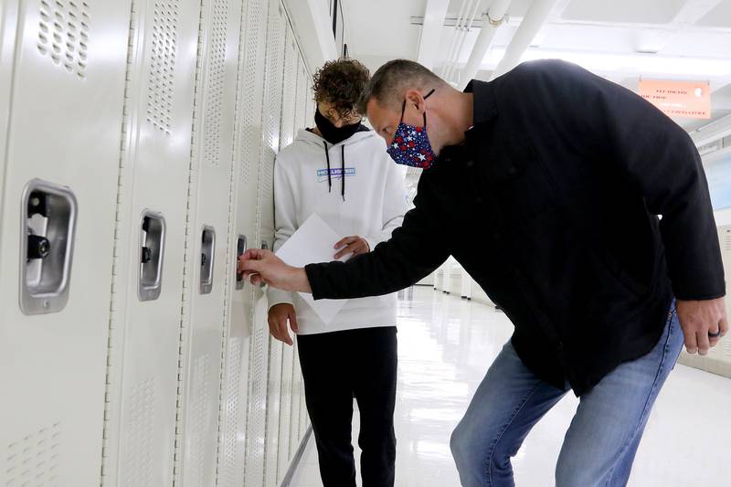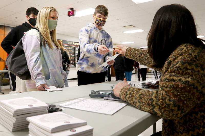 Freshman Conner Klein, 14, is handed his student identification card from staff member Sunday Johnson, right, as Klein and his mother Traci, left, prepare to search the hallways for Conner's classrooms and locker during an open house for the students and their parents at McHenry High School West Campus on Wednesday, Jan. 13, 2021 in McHenry. The school is continuing with its $44 million construction project and opened its doors to incoming freshmen, new students, and their parents to locate the students' lockers and classrooms easily and with less anxiety. Many of the students attending the open house have been taking classes remotely and are seeing the inside of the school for the first time. (Matthew Apgar/Matthew Apgar)
