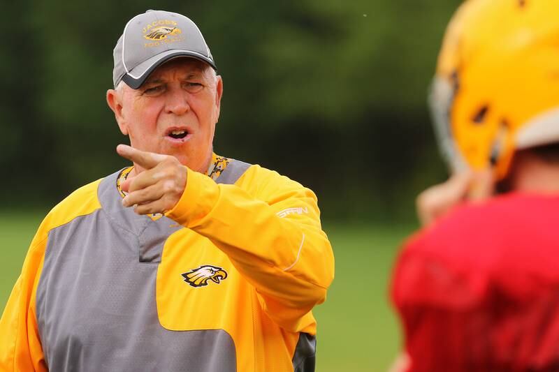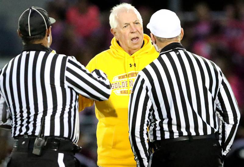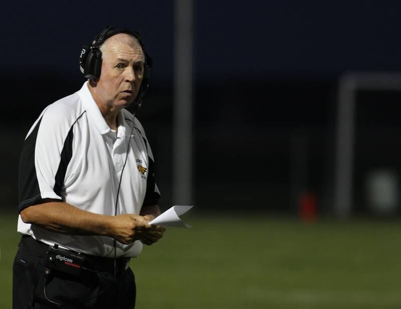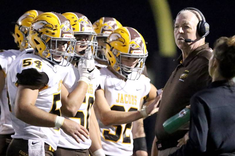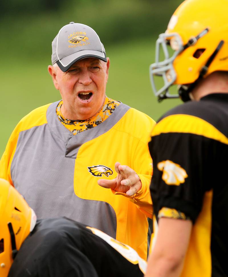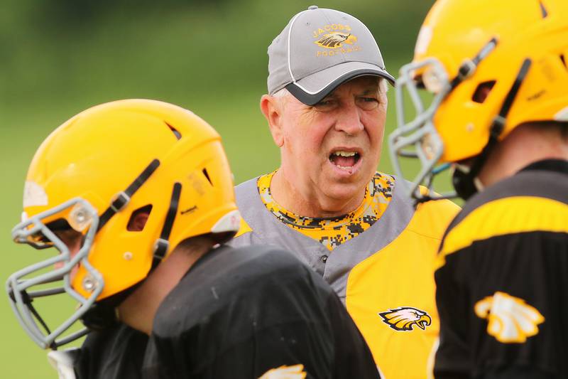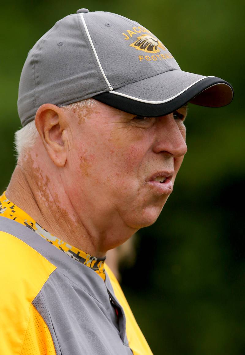 High School Football Huntley vs Jacobs Jacobs' head coach Bill Mitz gathers his players during a time out against the season opener against Huntley on Friday, Aug,26, 2016. (H. Rick Bamman/H. Rick Bamman)