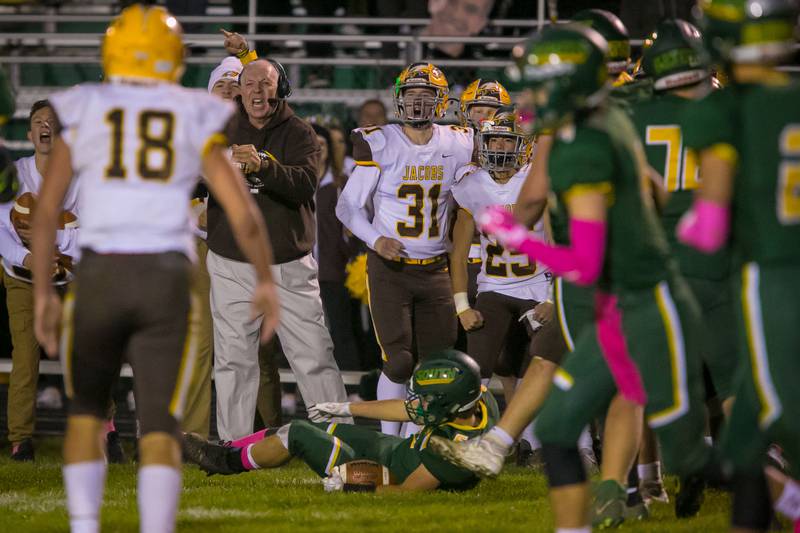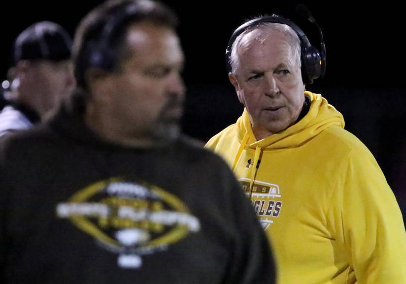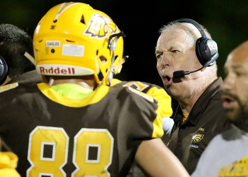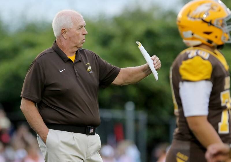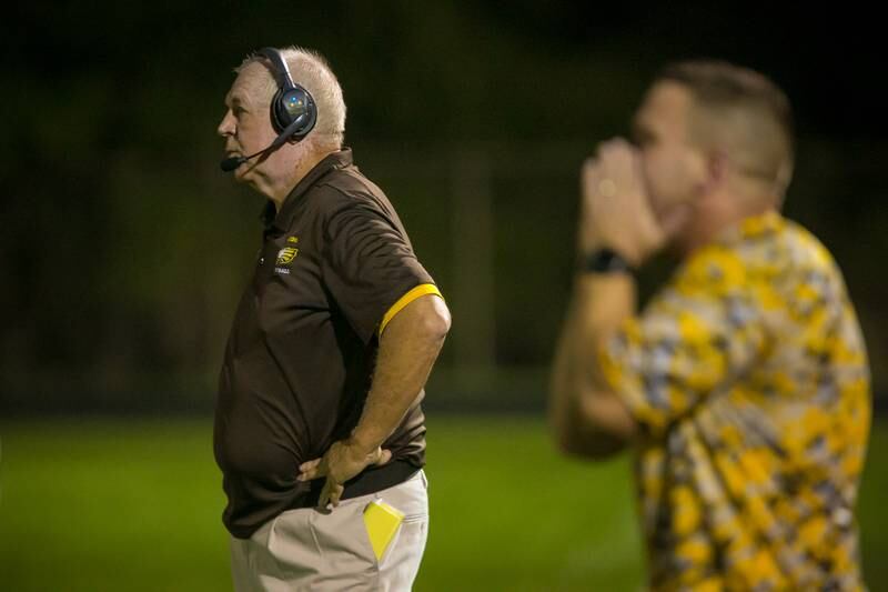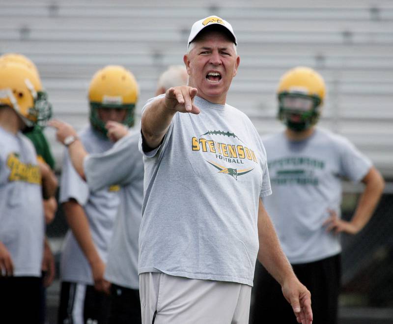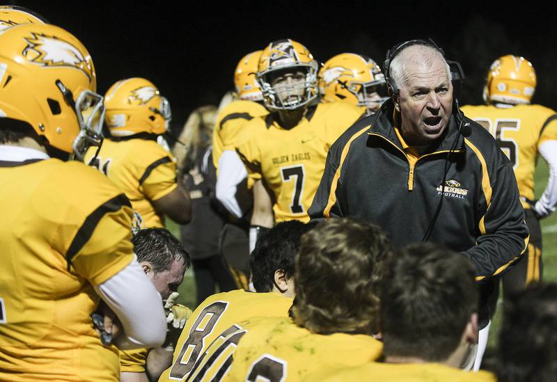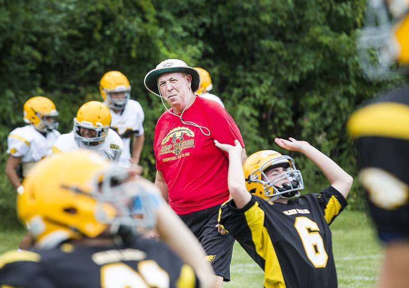 High School Football Huntley vs Jacobs Jacobs' head coach Bill Mitz gathers his players during a time out against the season opener against Huntley on Friday, Aug,26, 2016. (H. Rick Bamman/H. Rick Bamman)