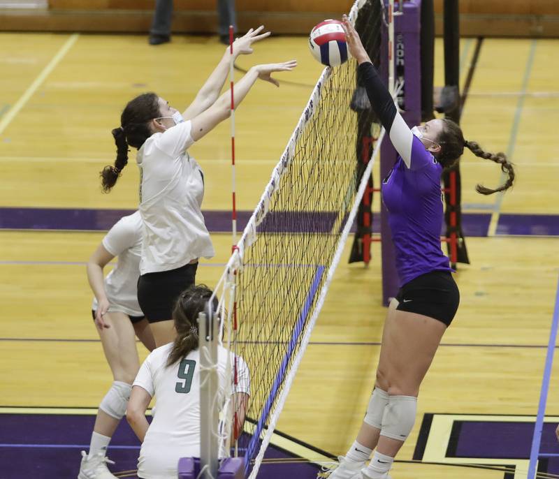Glenbard WestÕs Makayla Webber goes up for the ball at the net against Downers Grove NorthÕs Sandy Brindl in Downers Grove March 23. (Mike Mantucca for Shaw Local)