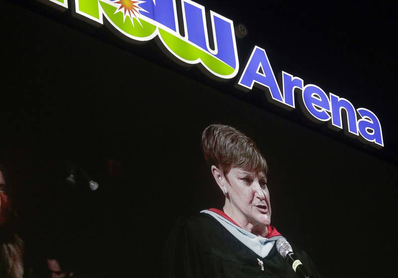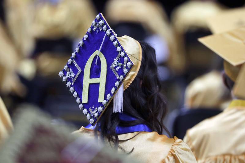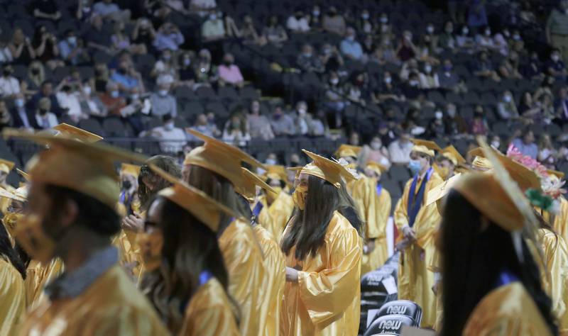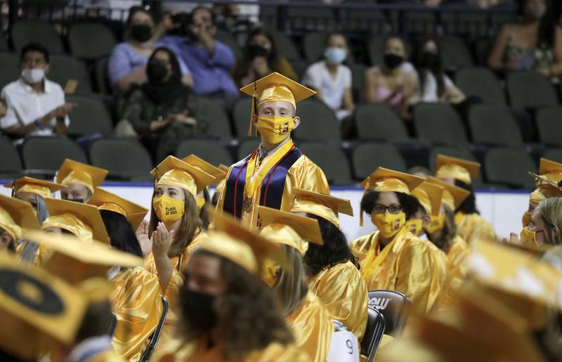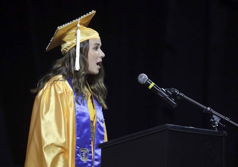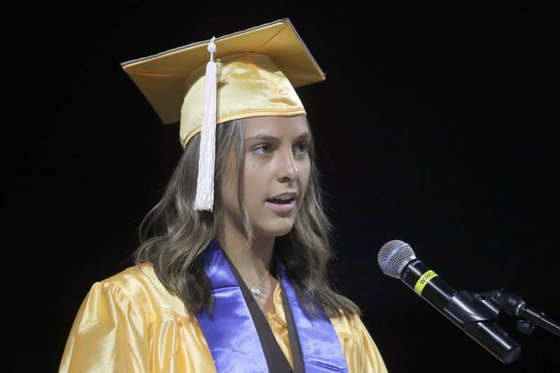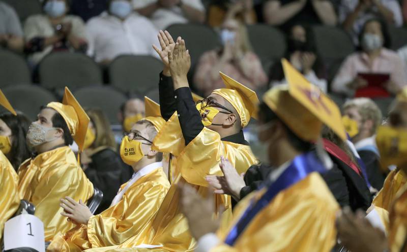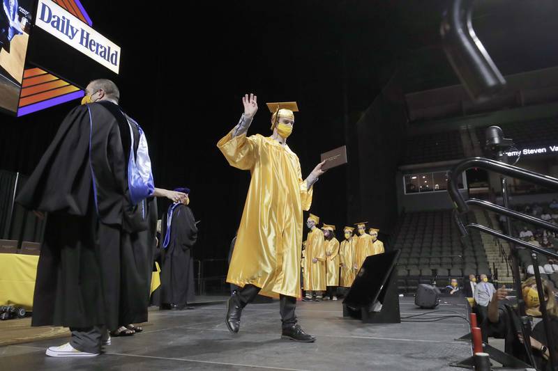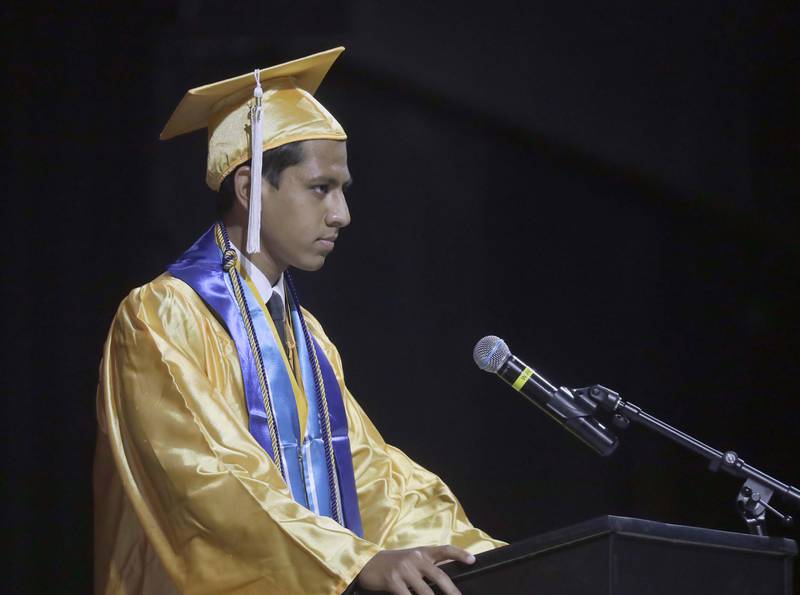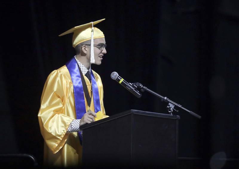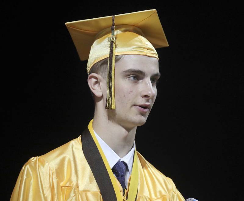 Senior Class President Ryan Frantik presents the class gift during the Jacobs High School graduation ceremony Saturday, May 22, 2021 at the NOW Arena in Hoffman Estates. (Brian Hill/Brian Hill/Daily Herald)