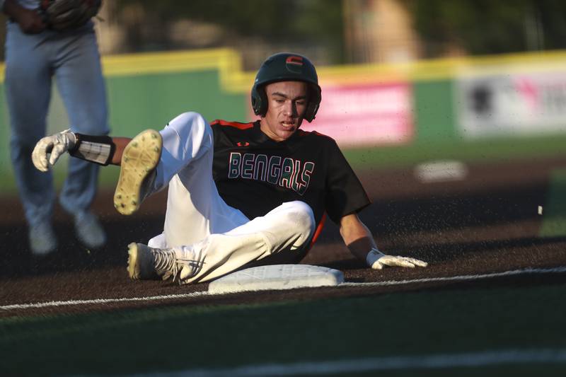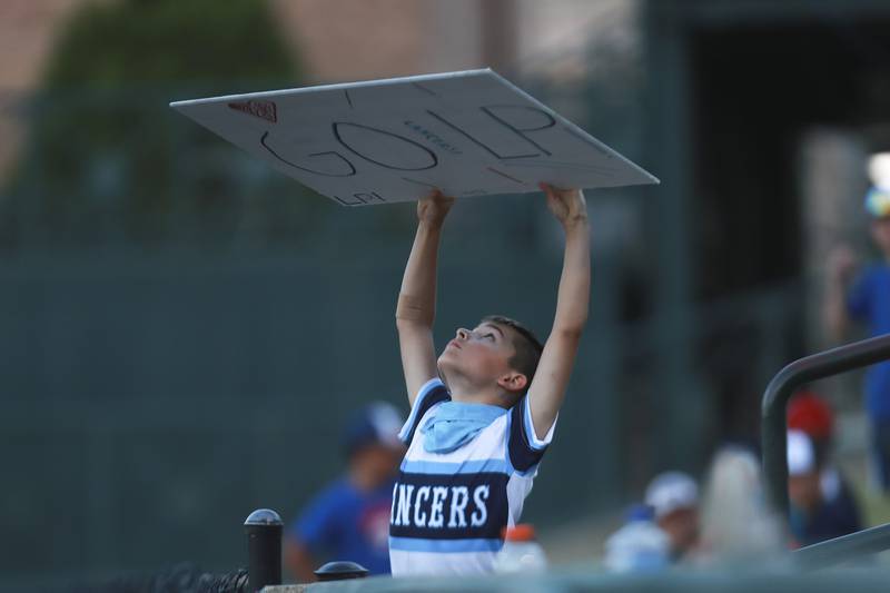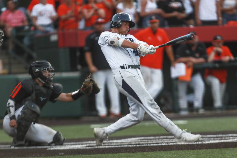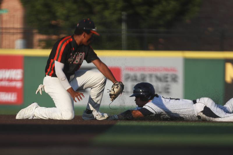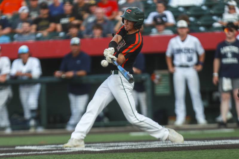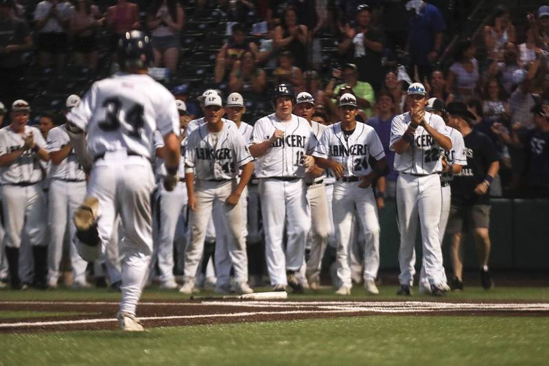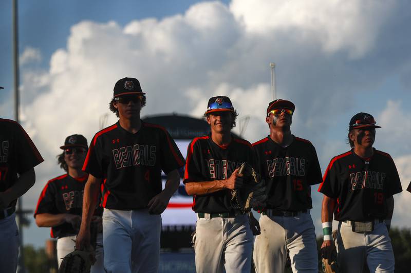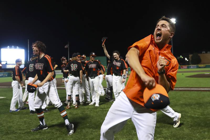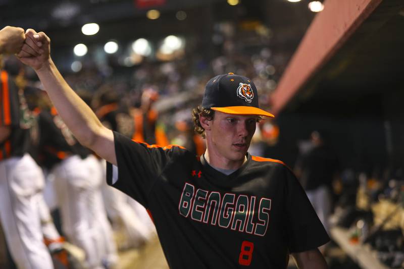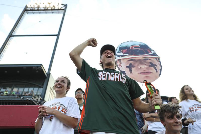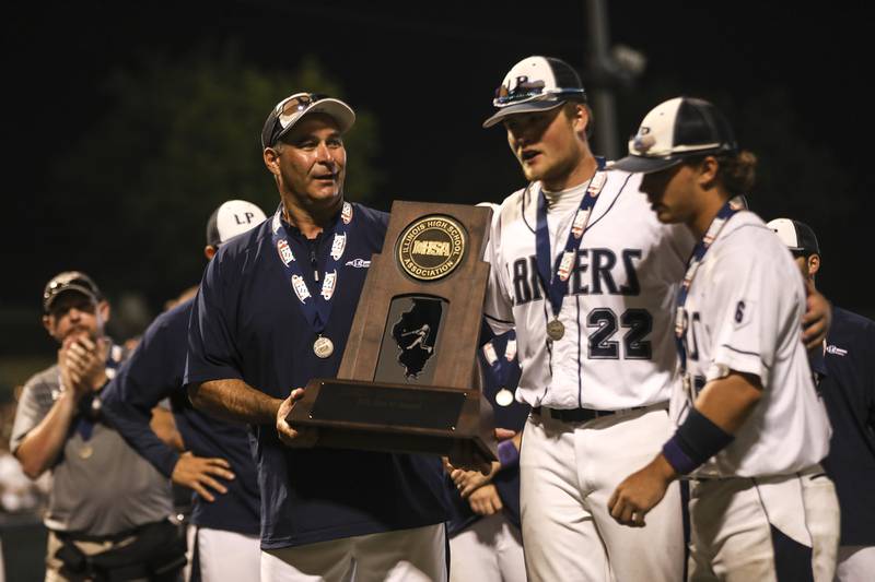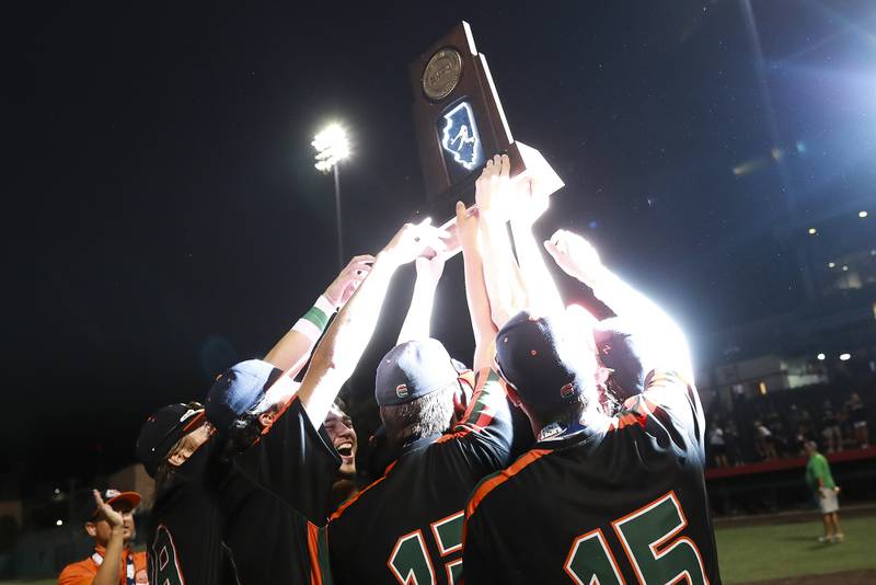 Plainfield East pitcher Gavin Schmitt lifts the State Championship trophy on Saturday, June 19, 2021, at DuPage Medical Group Field in Joliet, Ill. The Bengals defeated the Lancer 6-5. (Geoff Stellfox - gstellfox@shawmedia.com/Geoff Stellfox - gstellfox@shawmedia.com)