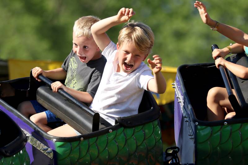 Lakeside Festival 2021 Christian King, left, and Hudson Everard, both 5, enjoy a ride on the roller coaster during the annual Lakeside Festival at the Dole and Lakeside Arts Park on Thursday, July 1, 2021, in Crystal Lake. (Matthew Apgar/Matthew Apgar)