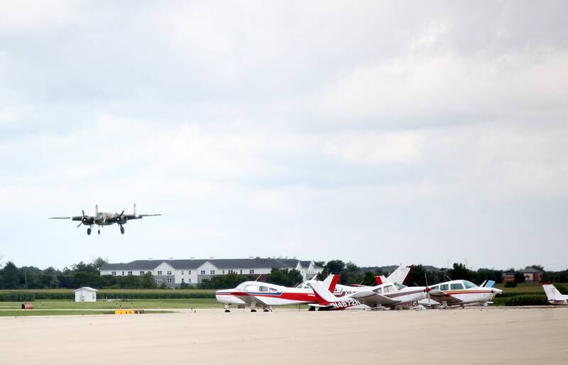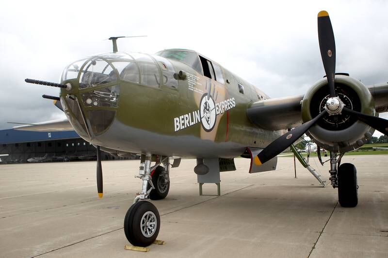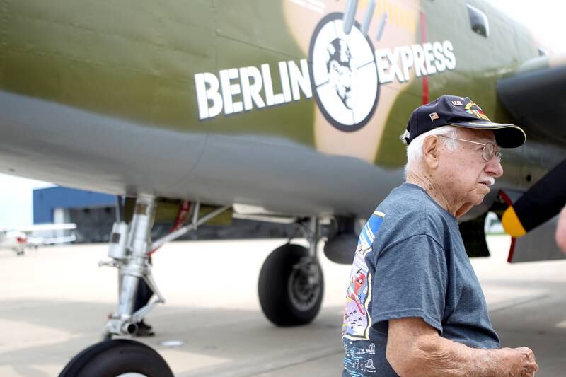 World War II Veteran Ted Micci stands next to a historic B-25 Mitchell from World War II before a flight at Aurora Municipal Airport in Sugar Grove on Thursday, July 15, 2021. The plane was brought to the area by the Experimental Aircraft Association (EAA). (Sandy Bressner - sbressner@shawmedia.com)