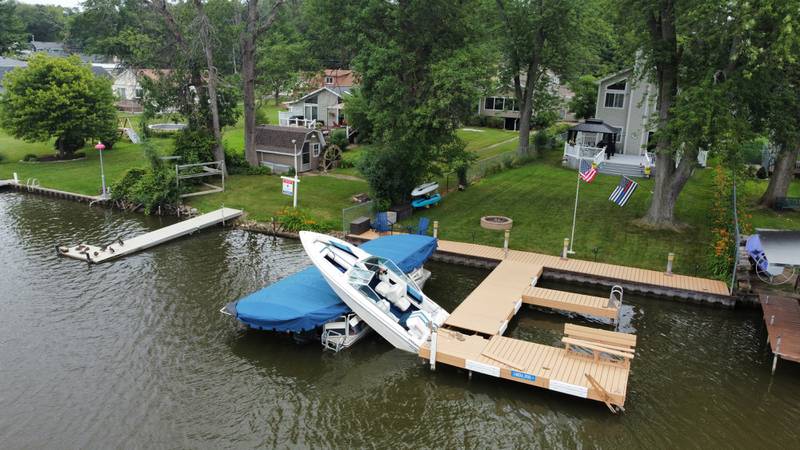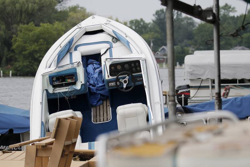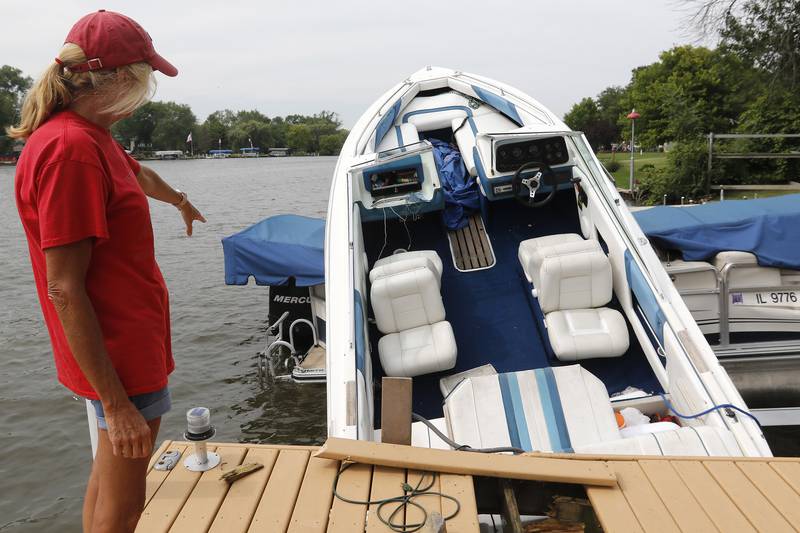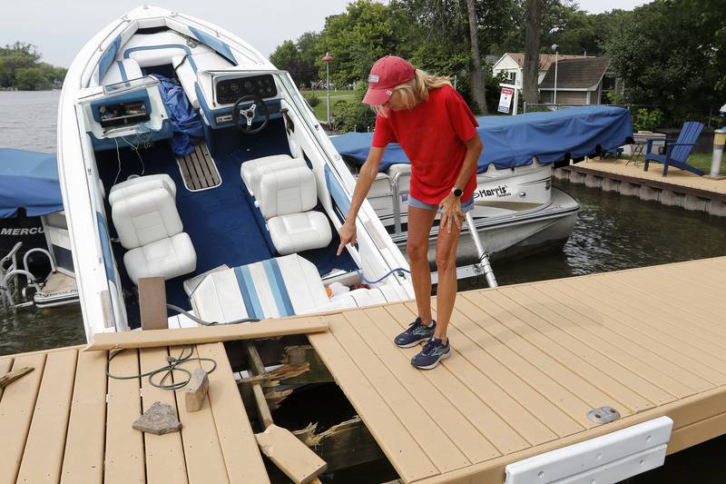 Boating accident on the Fox River in McHenry Homeowner Pam Petrucci, of McHenry, shows the damage to her dock and pontoon on Friday, July 16, 2021 in McHenry. Petrucci said a boat crashed into her dock, launching it atop her pontoon shortly after midnight Friday. Petrucci said she hopes the crash will be cleared up before the traffic on the river picks up over the weekend for fear of excessive wakes sinking her boat. (Matthew Apgar/Matthew Apgar)