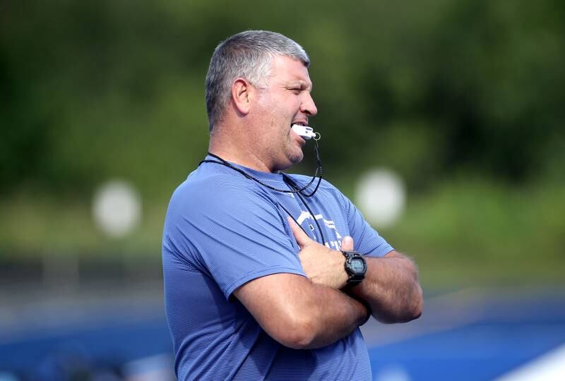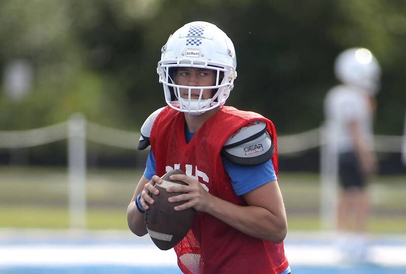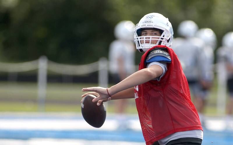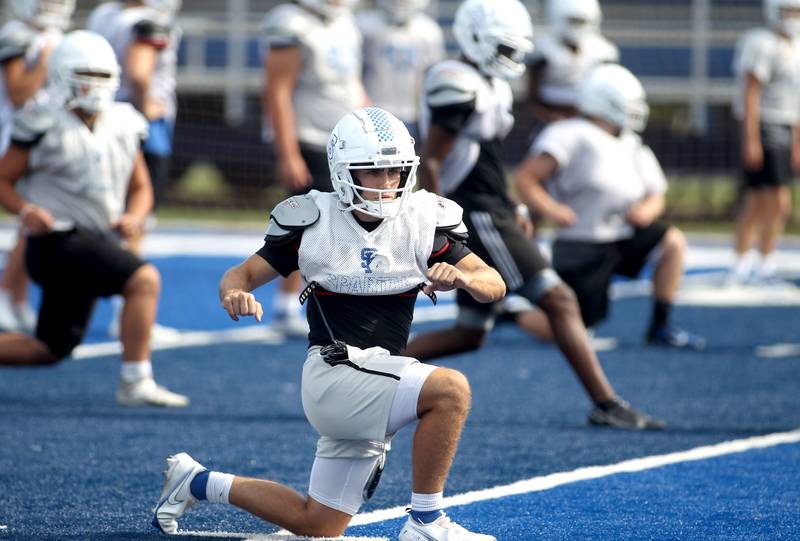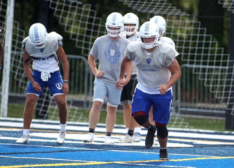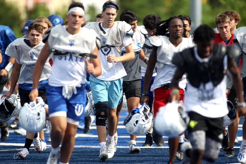 St. Francis players jog to a water break during a practice in Wheaton on Friday, Aug. 13, 2021. (Sandy Bressner - sbressner@shawmedia.com)