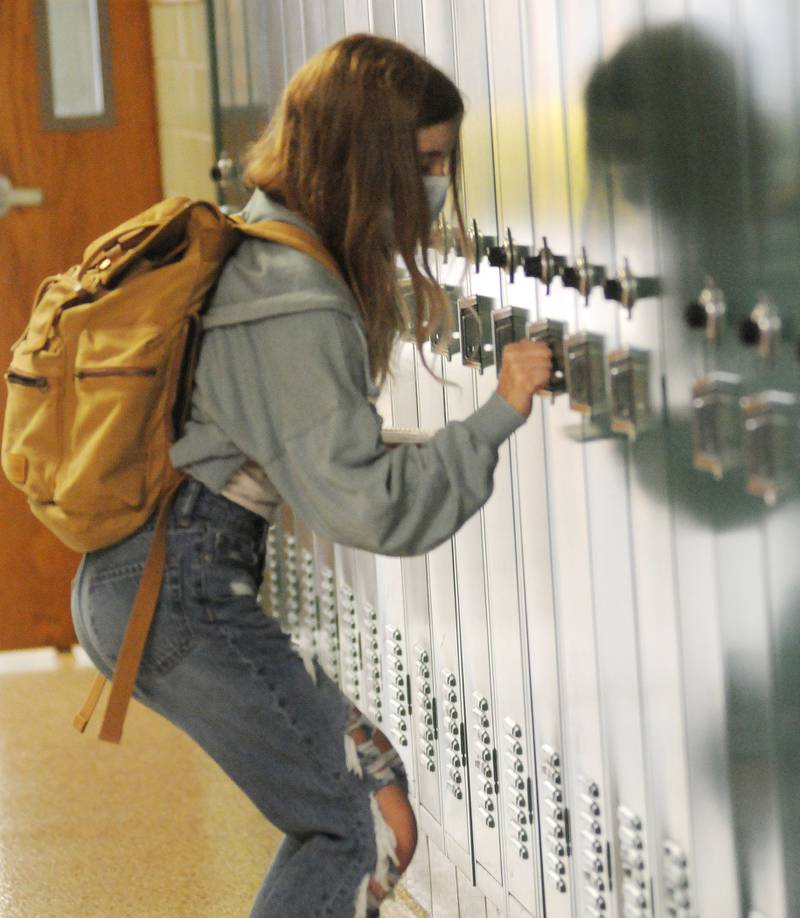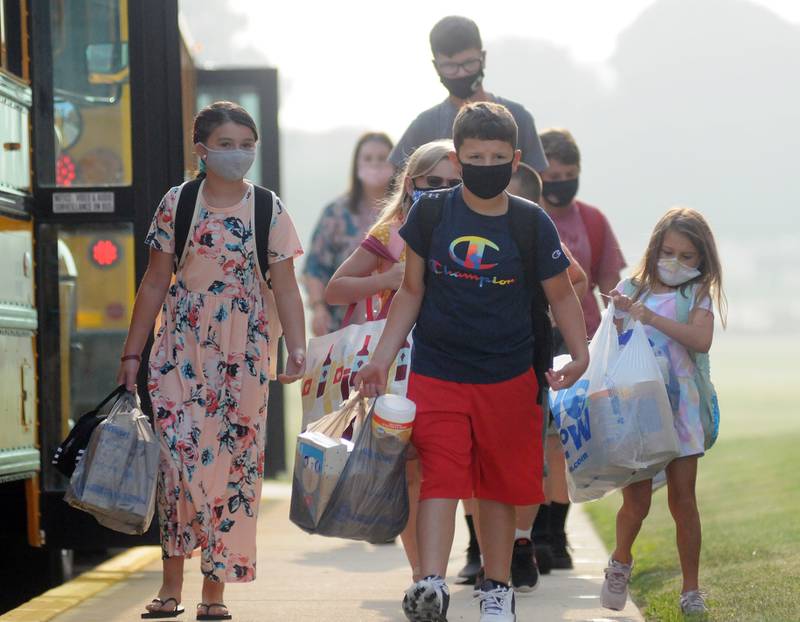 Grand Ridge Grade School first grade teacher Mrs. Velazquez greets her students on the first day of school on Wednesday, Aug. 18, 2021. (Katy Arnold for Shaw Media)