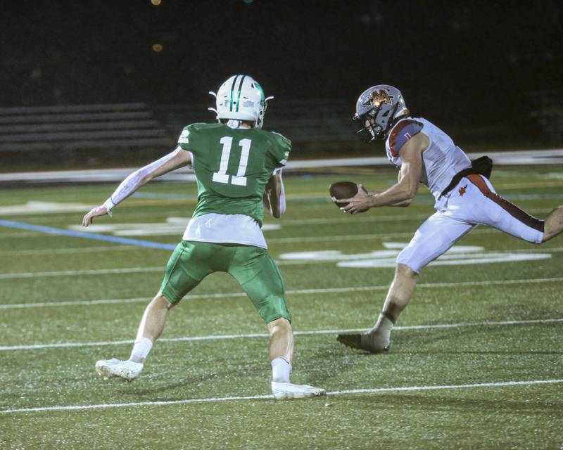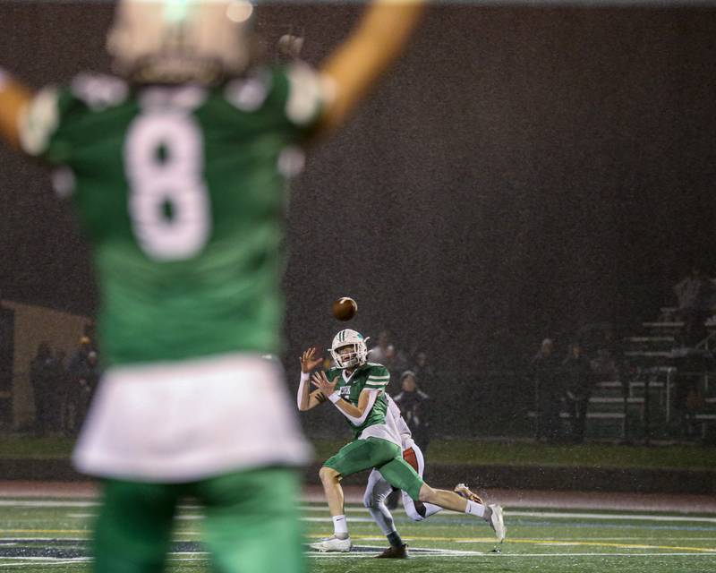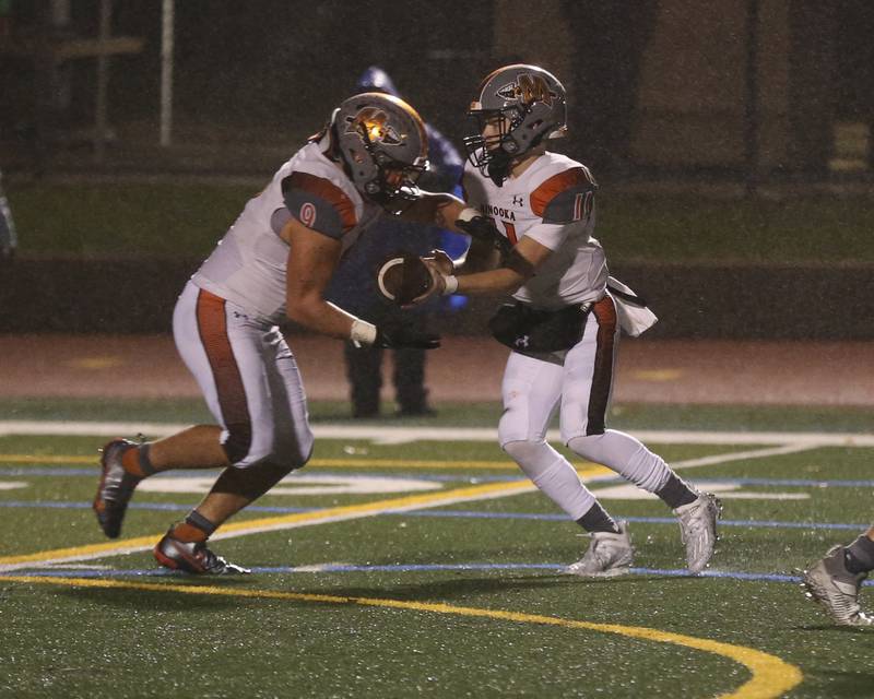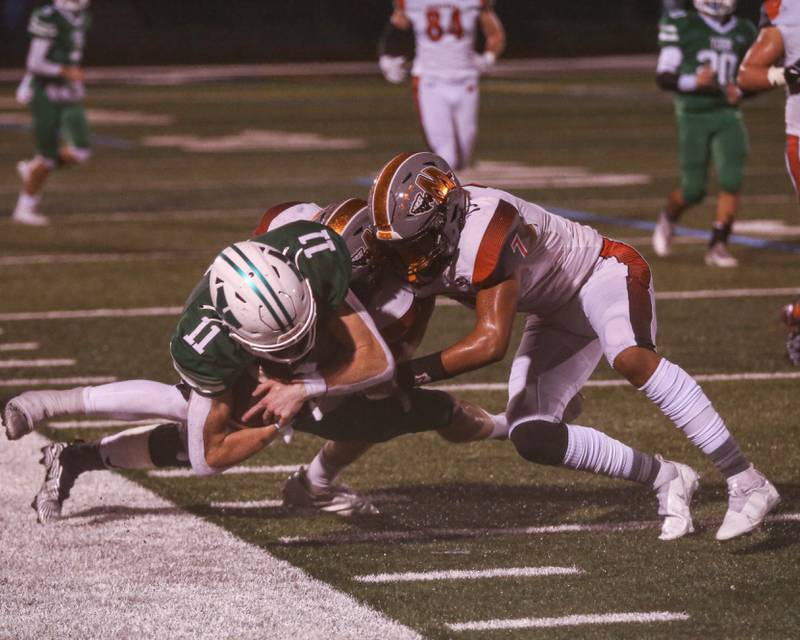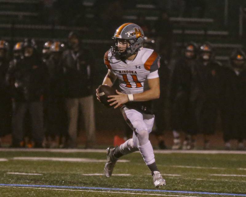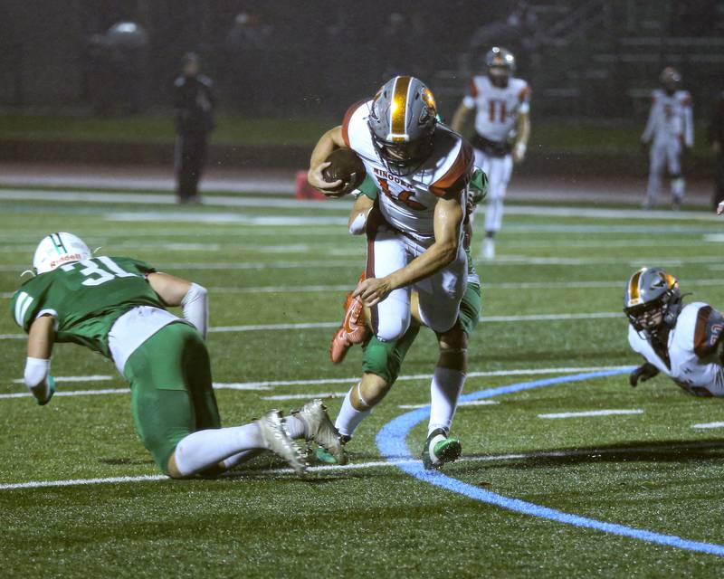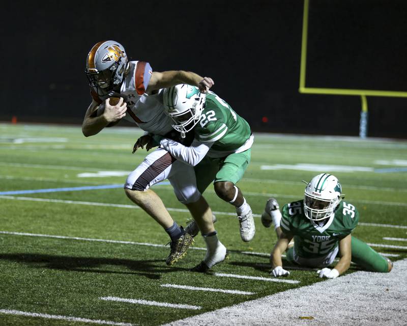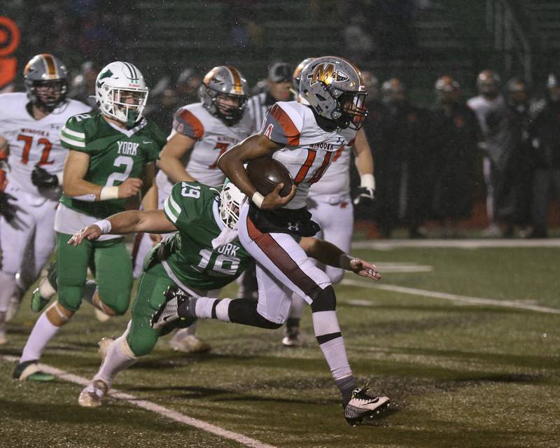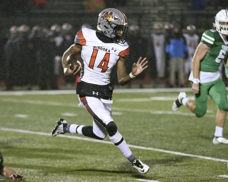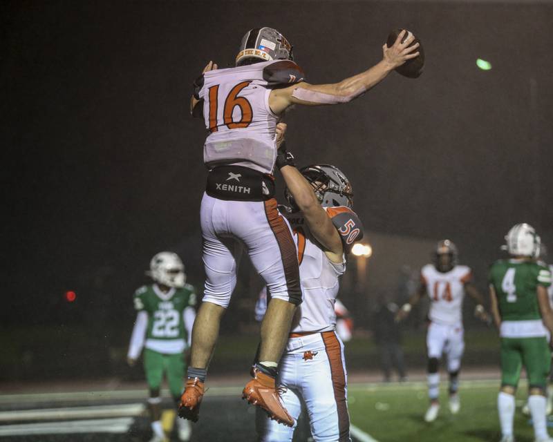 Minooka at York Minooka's Ethan Murphy (16) celebrates his touchdown with Sean Williamson (50) during Class 8A playoffs first-round game between Minooka at York. Oct 29, 2021. (Gary E Duncan Sr for Shaw Local)