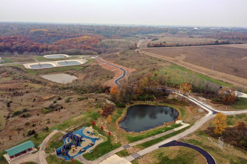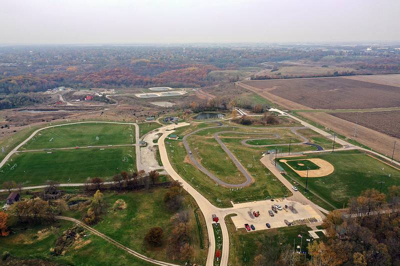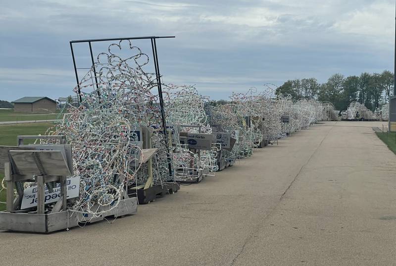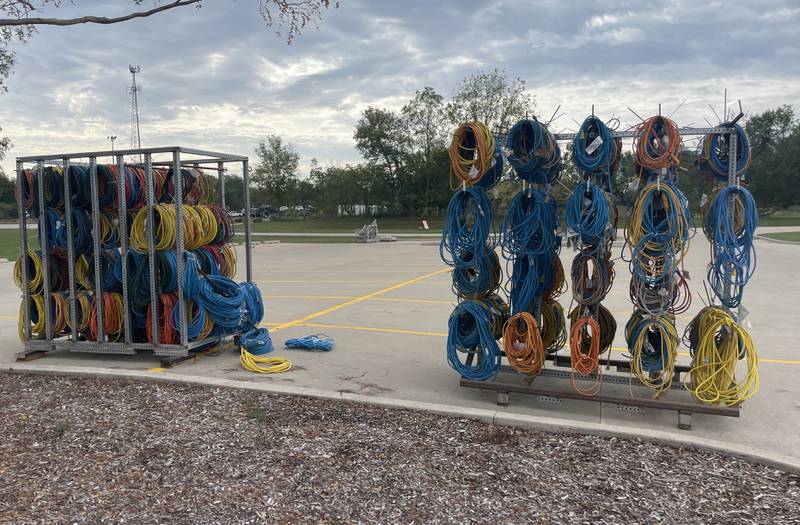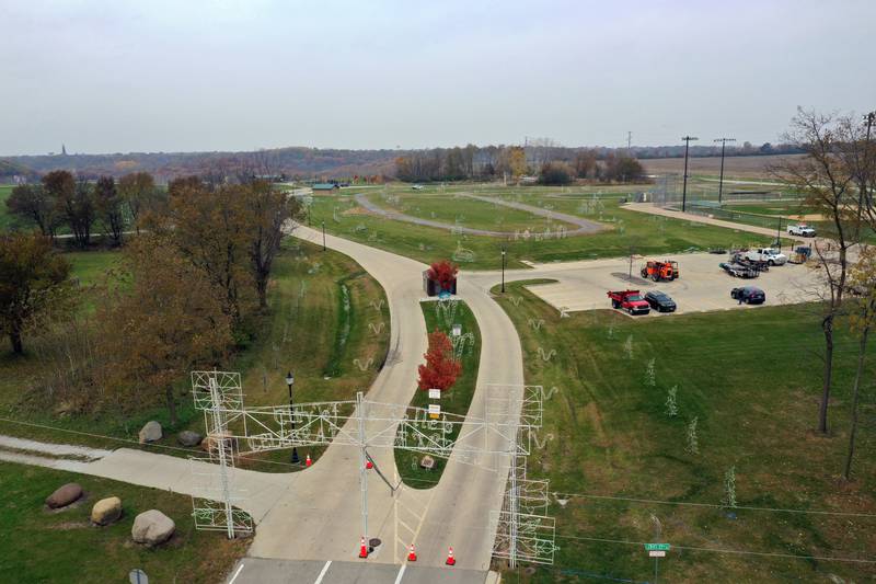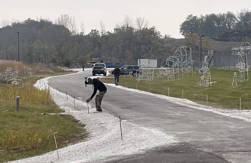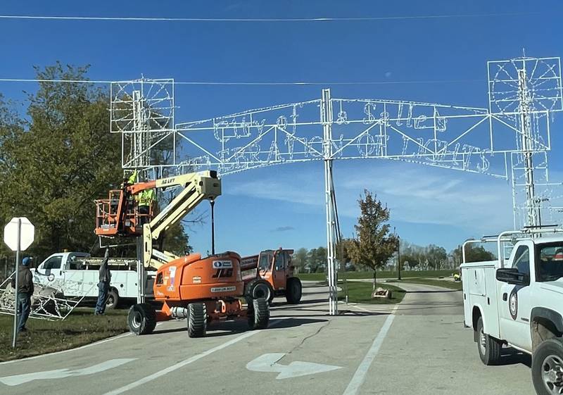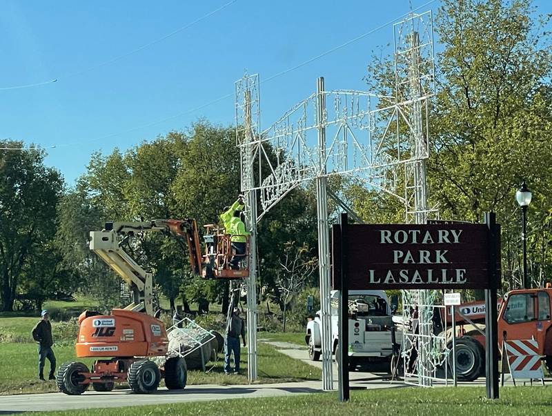 La Salle crews hang the Celebration of Lights banner at Rotary Park on Tuesday, Oct. 26, 2021 in La Salle. The city has expanded the lights again this year. (Scott Anderson)