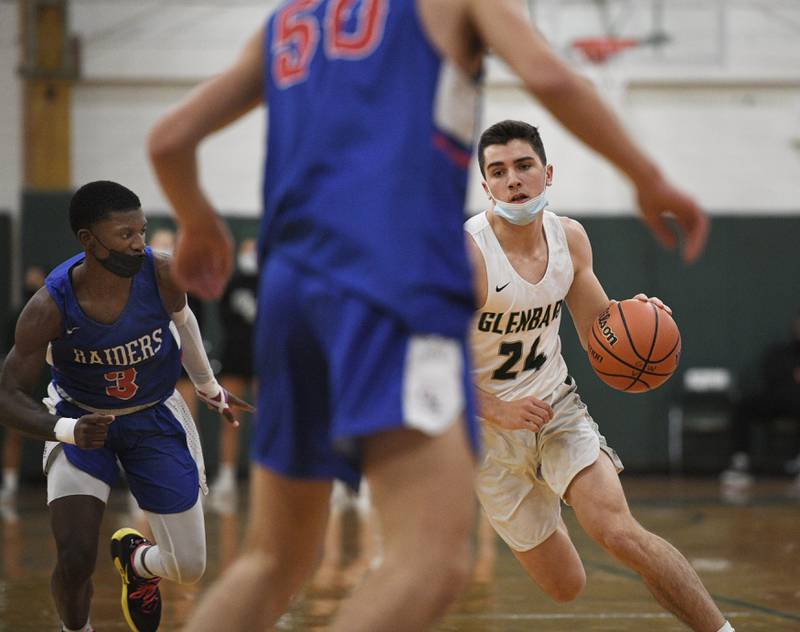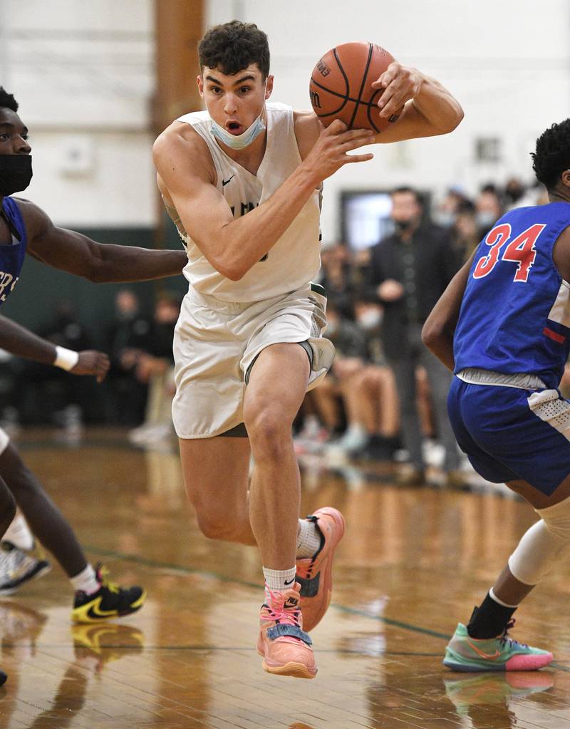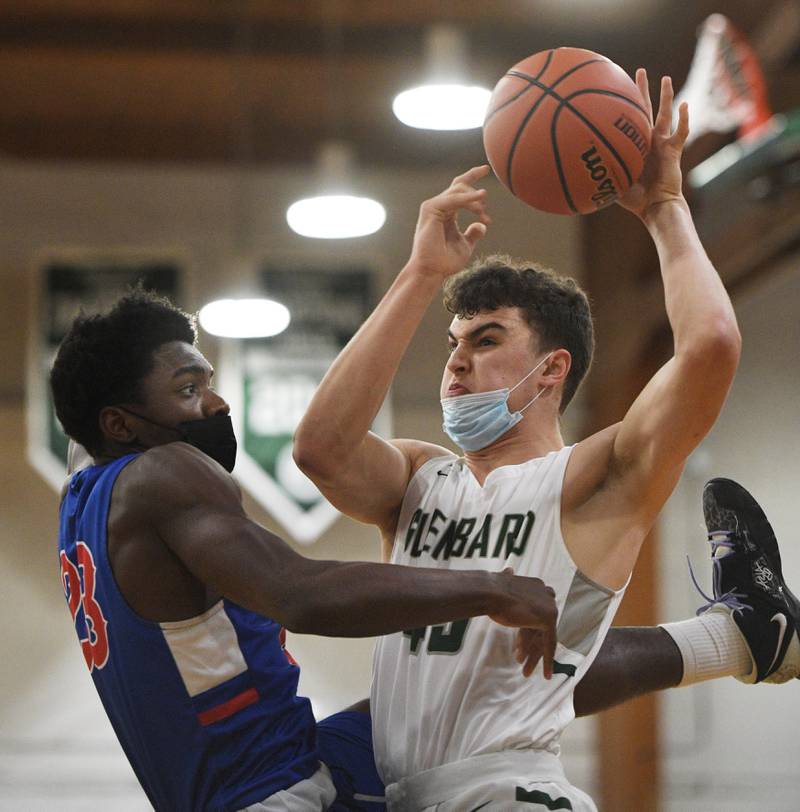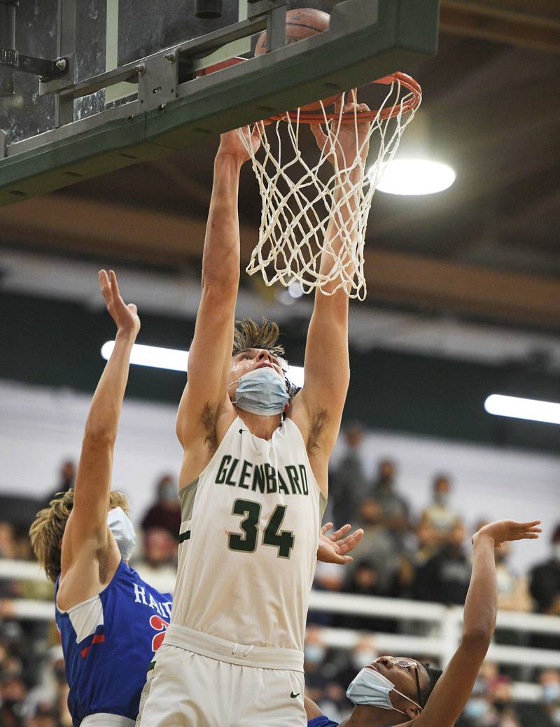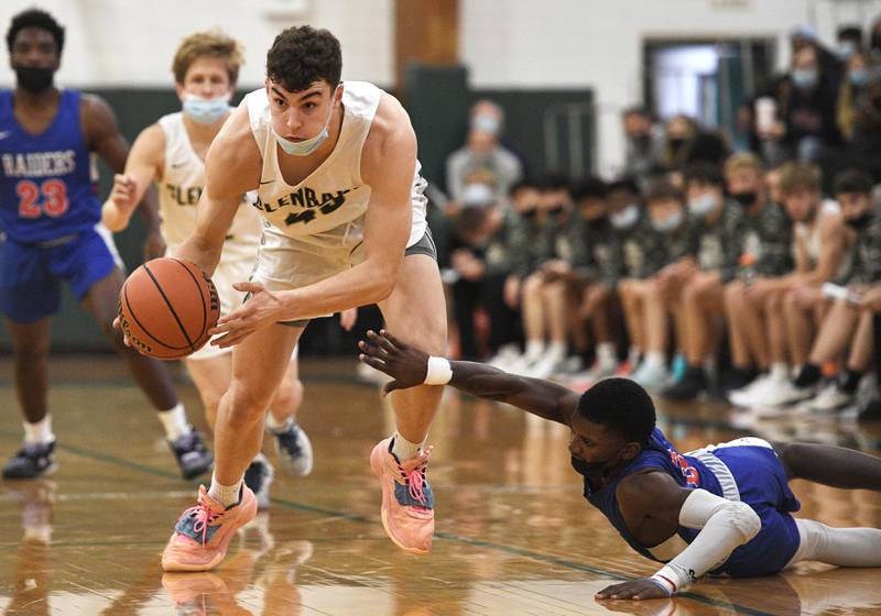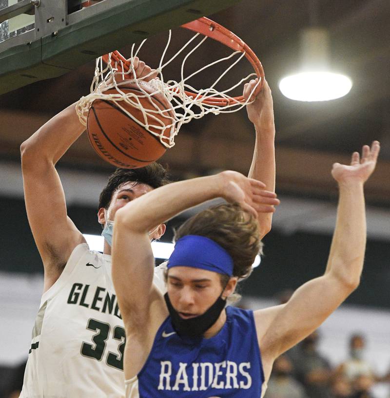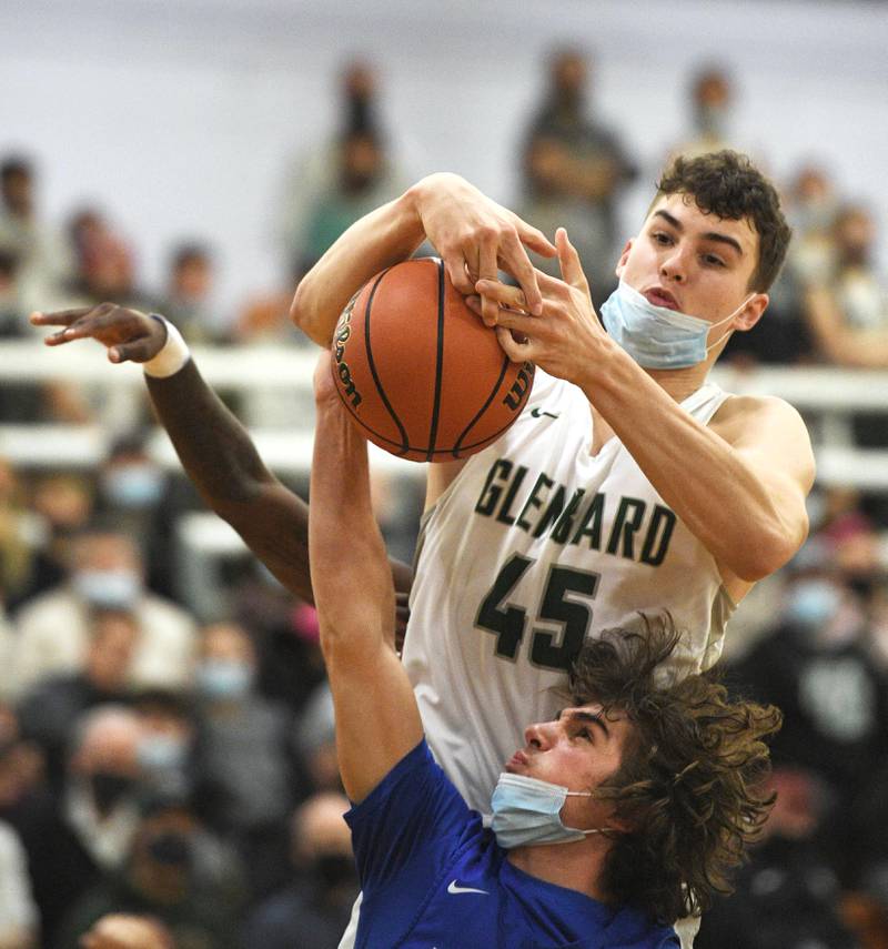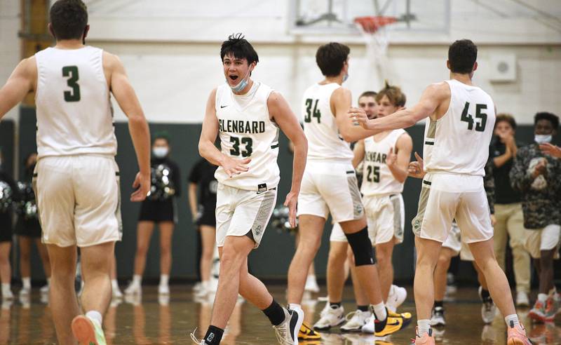 John Starks/jstarks@dailyherald.com Glenbard West’s Bobby Durkin celebrates a big lead with teammates during a time out against Glenbard South in a boys basketball game in Glen Ellyn on Monday, November 22, 2021. (John Starks/John Starks)