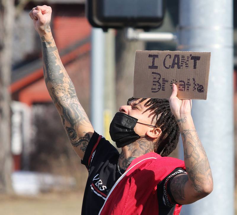 Deangelo Coleman, 5, from DeKalb, stands with other protesters Friday in front of the DeKalb Police Department. The protest, organized by the group For the People-DeKalb, was marching against police brutality on the heels of Duante Wright's shooting by police in Minnesota, the Derek Chauvin trial for the death of George Floyd and the release of the video of the police shooting of 13-year-old Adam Toledo in Chicago. (Mark Busch - mbusch@shawmedia.com/Mark Busch - mbusch@shawmedia.co)