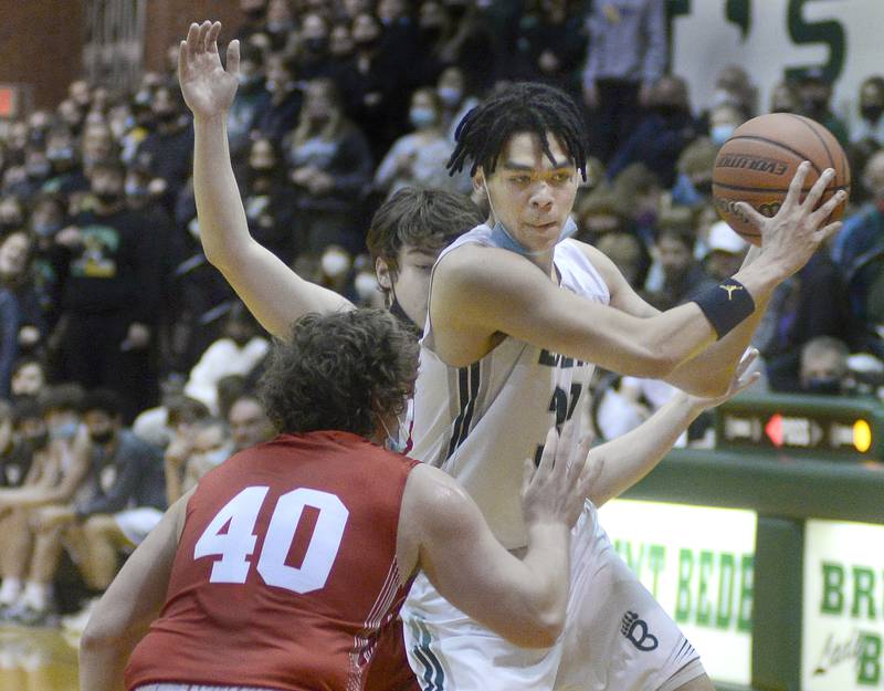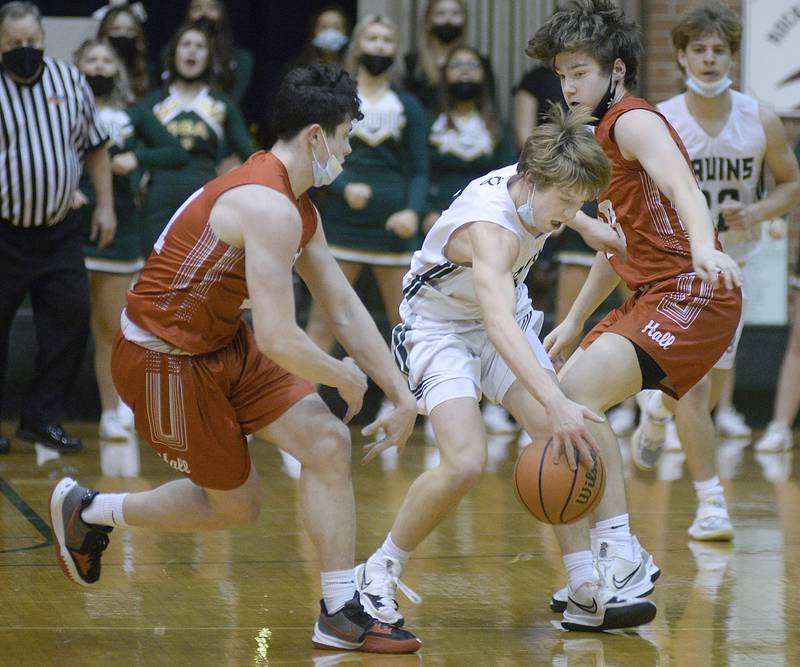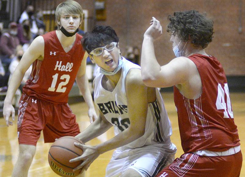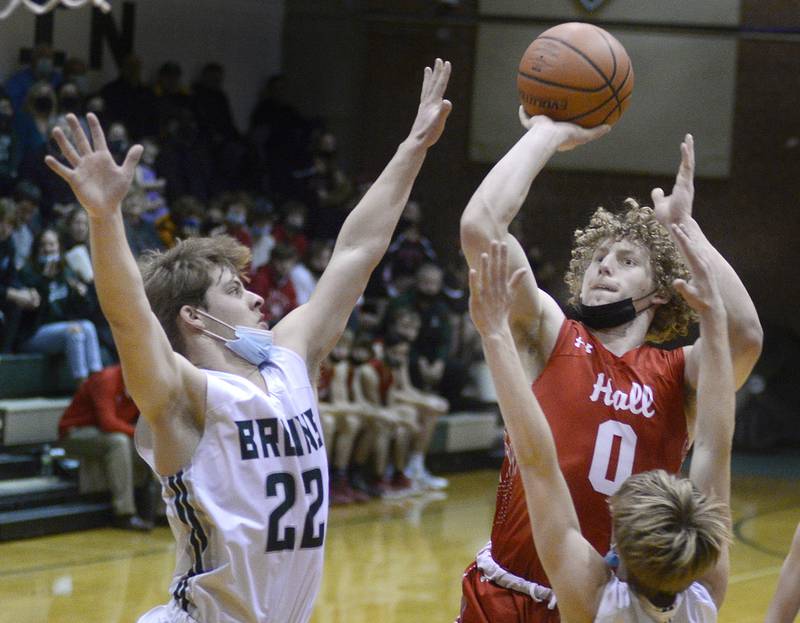 Hall’s Mac Resetich, (0) shoots over the St Bede defense of Luke Story, (22) and John Brady in the 1st period Tuesday at St Bede on Tuesday Jan. 18, 2022. (Tom Sistak)