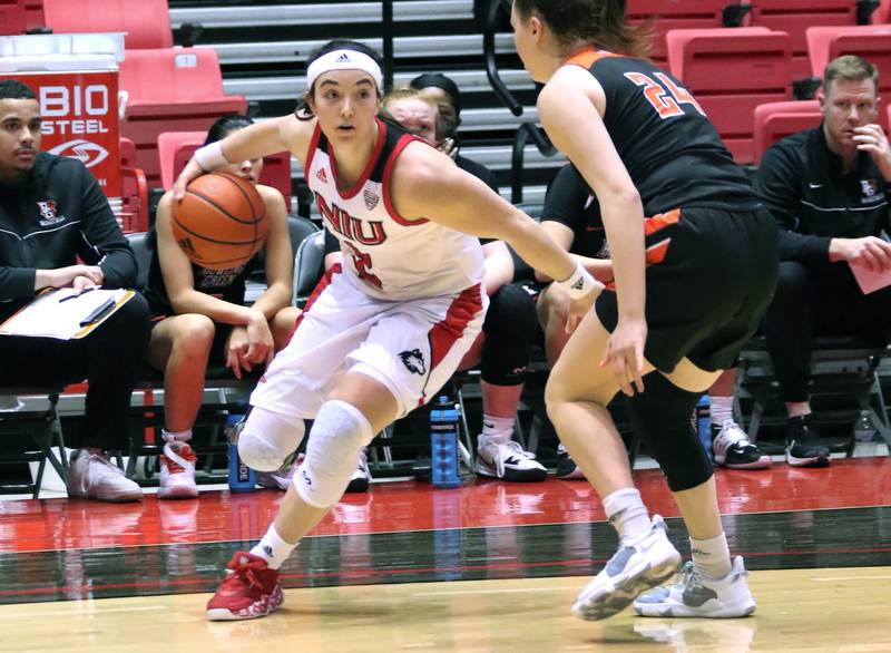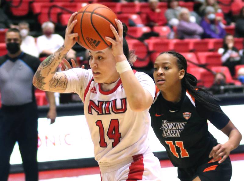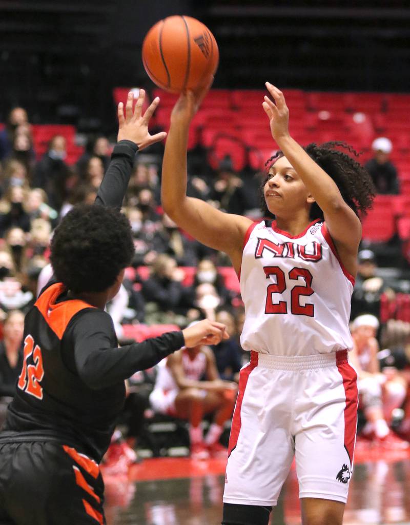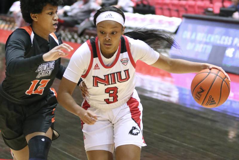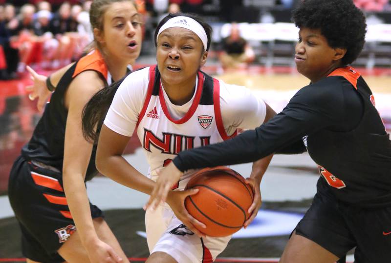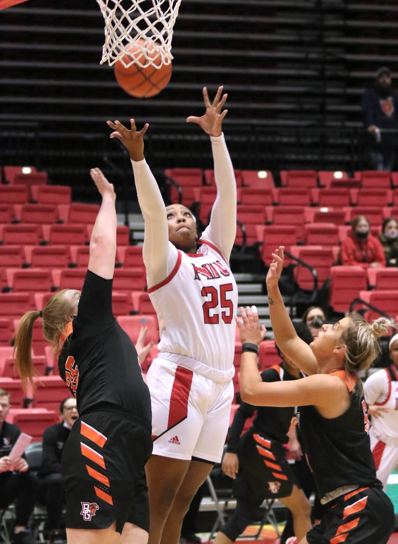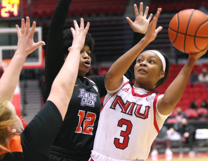 Northern Illinois Huskies guard Jayden Marable shoots between Bowling Green Falcons guard Nyla Hampton and forward Kadie Hempfling during their game Wednesday, Feb. 2, 2022, in the Convocation Center at Northern Illinois University in DeKalb. (Mark Busch - mbusch@shawmedia.com/Mark Busch - mbusch@shawmedia.co)