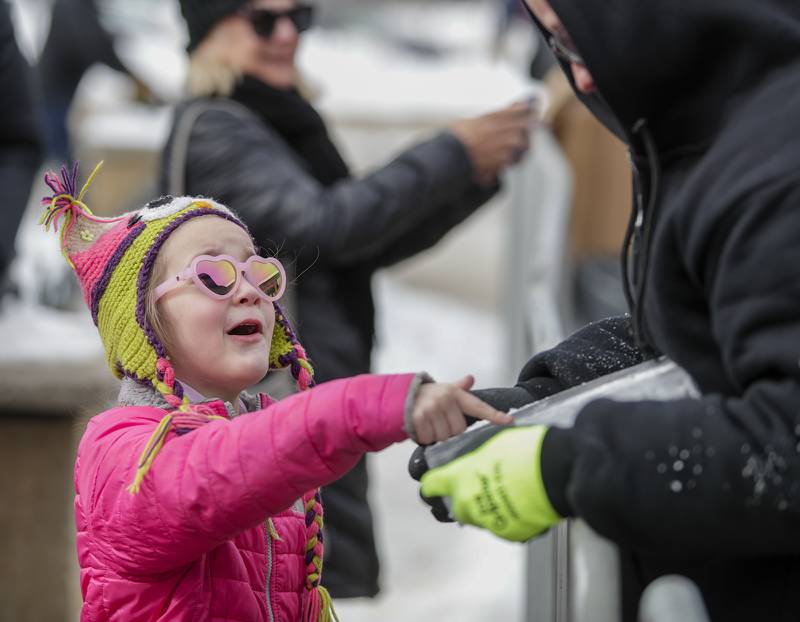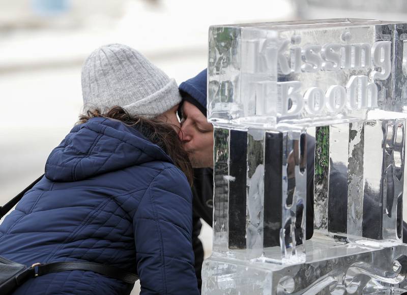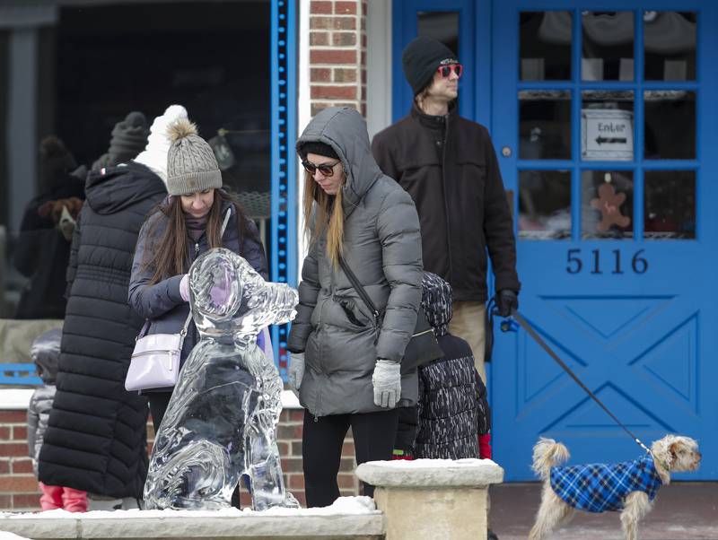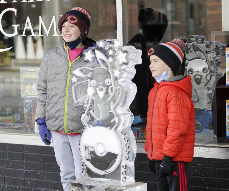 Brothers Colin, 12, and Kyle, 7, Schmitt of Downers Grove take a photo with an ice sculpture at the Downers Grove Ice Fest in Downers Grove on Sunday, Feb. 6, 2022. (Mike Mantucca for Shaw Local)