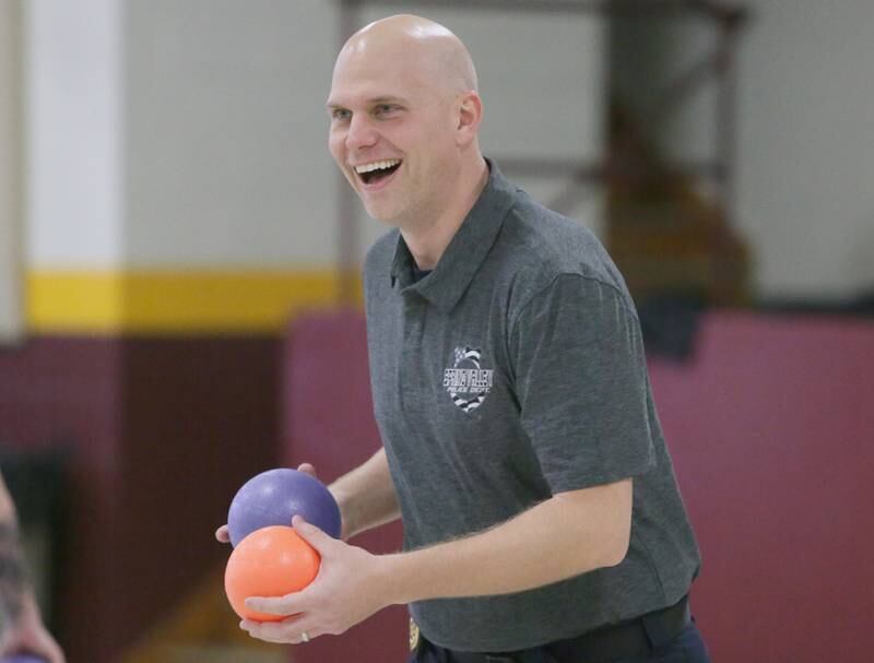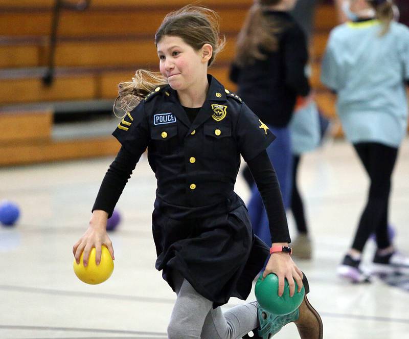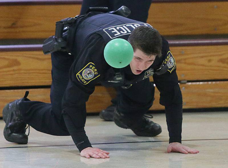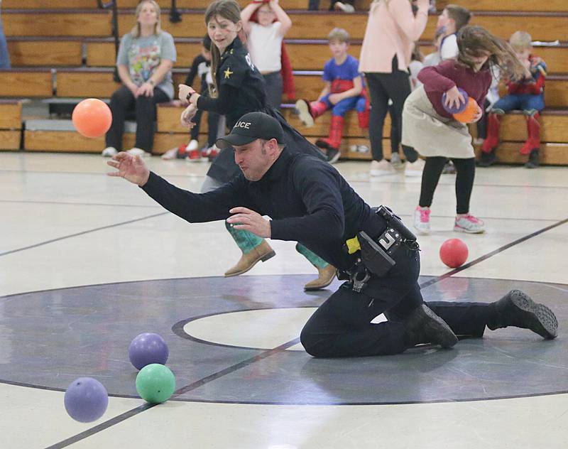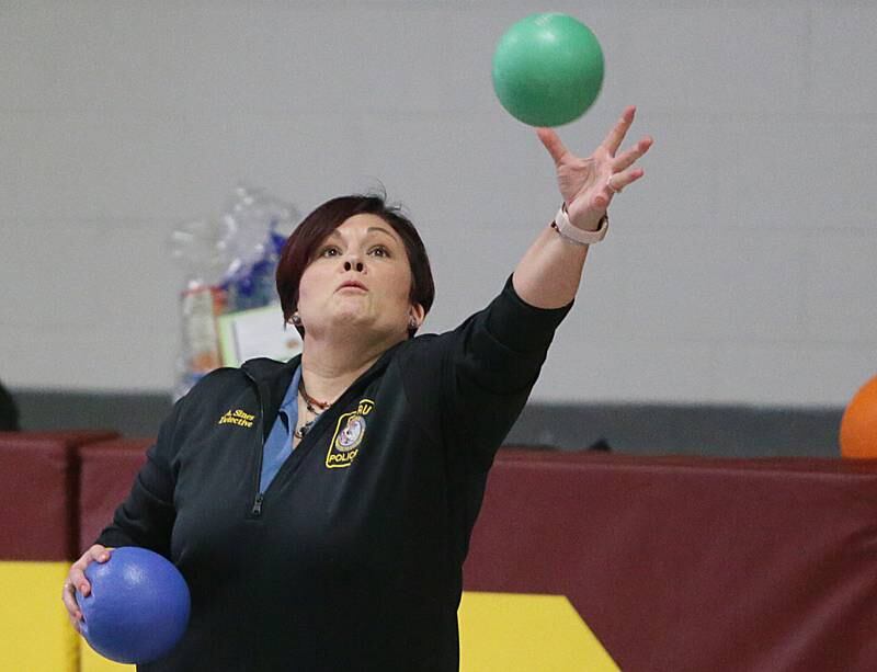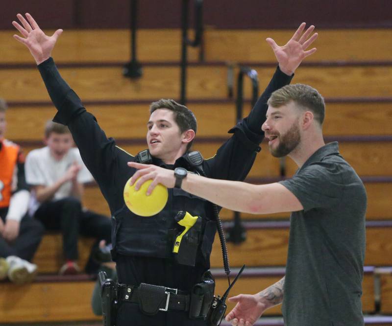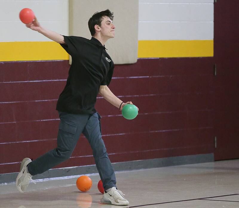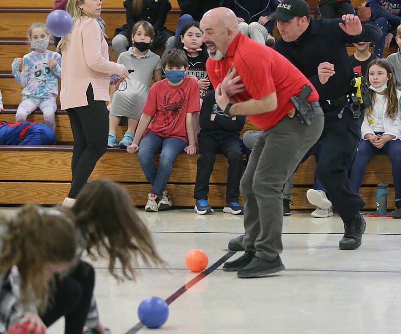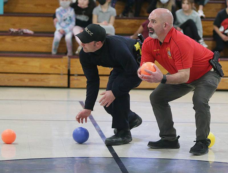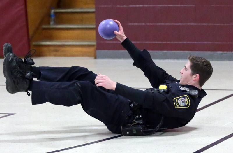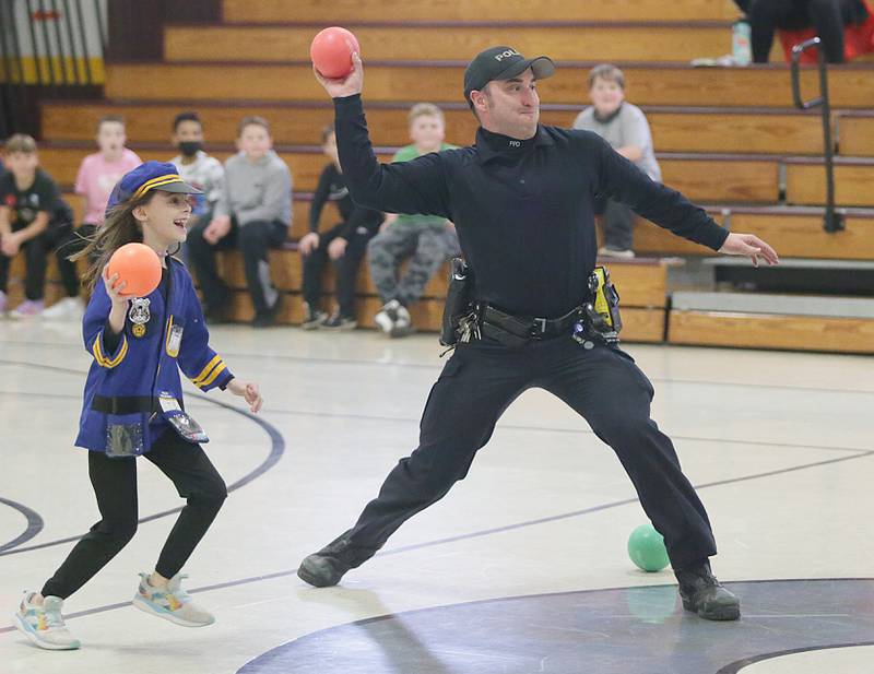 Peru Police officer Nick Biagioni, teams up with Cece Baird, student at Peru Catholic School, to throw dodgeballs at other officers on Thursday Feb. 10, 2022 at Peru Catholic School in Peru. (Scott Anderson)