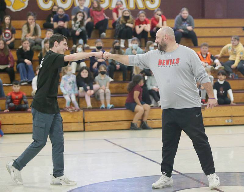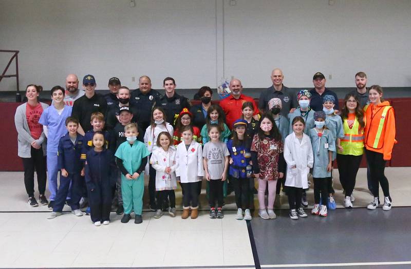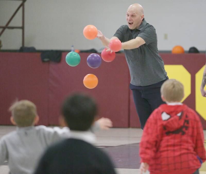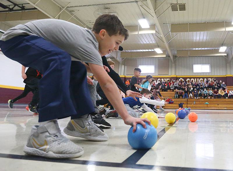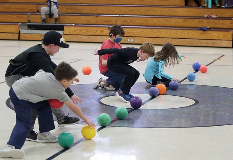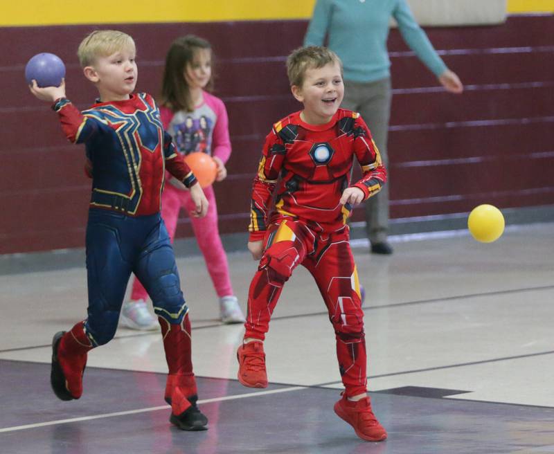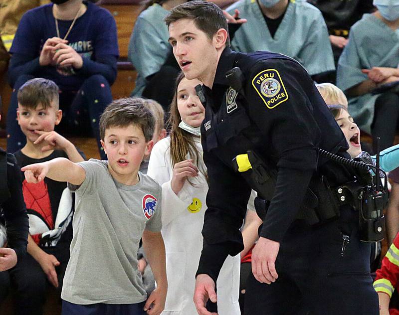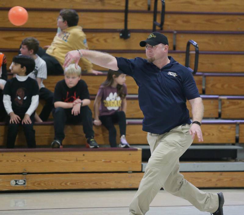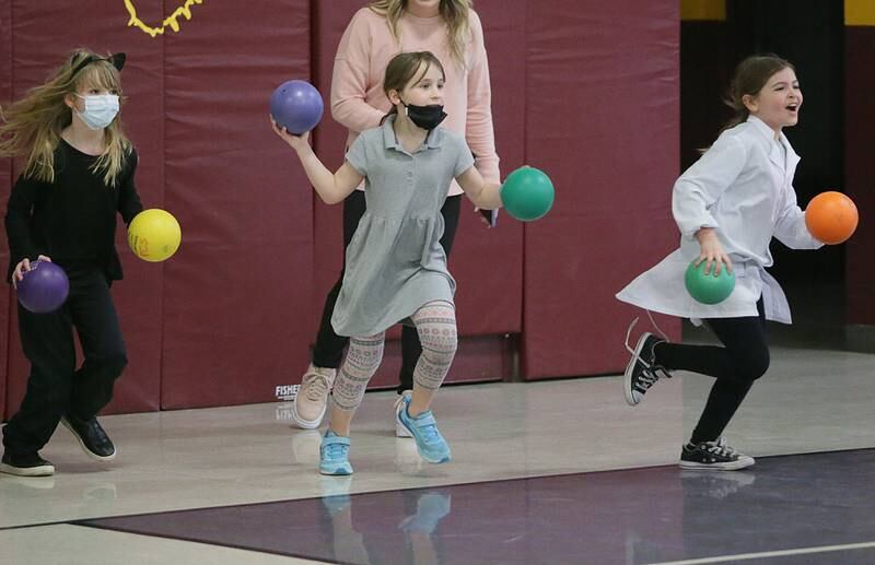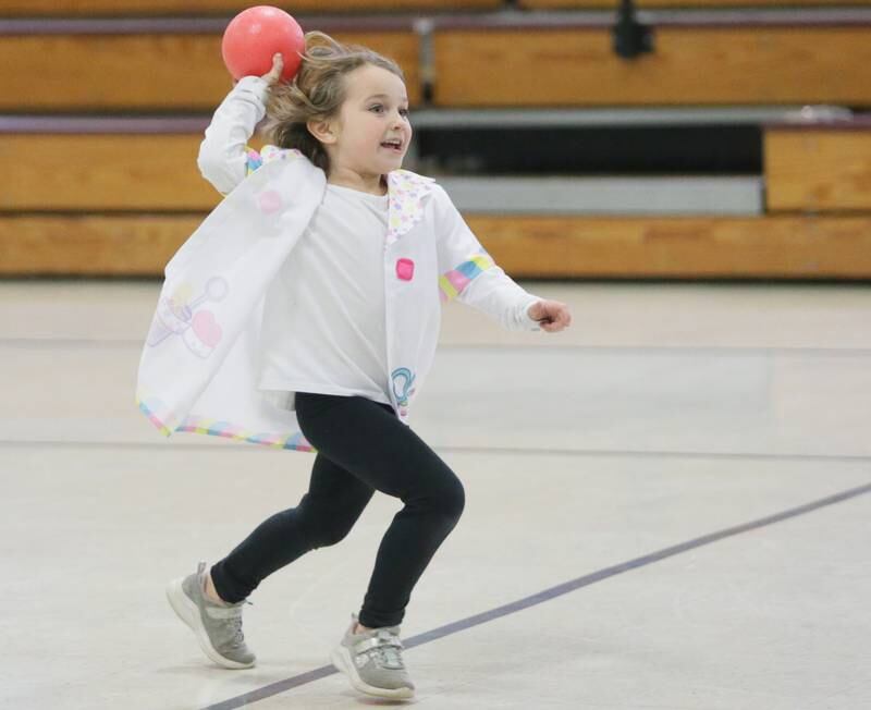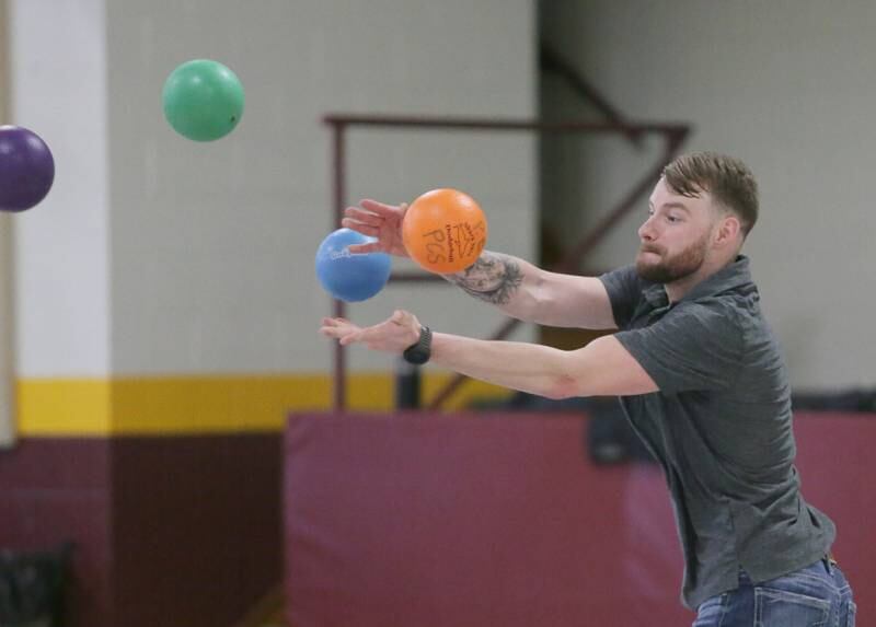 Peru Police officer Nick Biagioni, teams up with Cece Baird, student at Peru Catholic School, to throw dodgeballs at other officers on Thursday Feb. 10, 2022 at Peru Catholic School in Peru. (Scott Anderson)