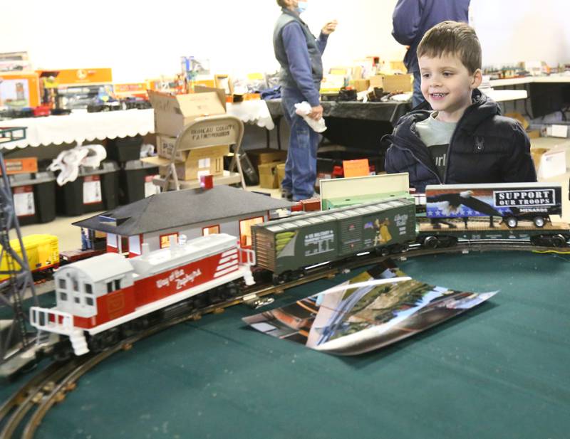 Everett Taylor, 4, of Utica, watches a Lionel Train move around the tracks at the Train and Toy show at the Bureau County Fairgrounds on Saturday Feb. 12, 2022 in Princeton. (Scott Anderson)