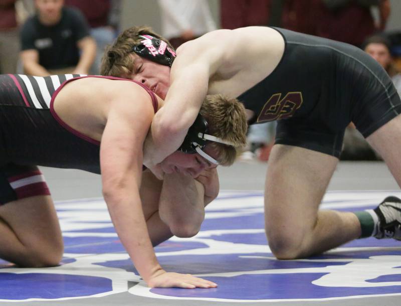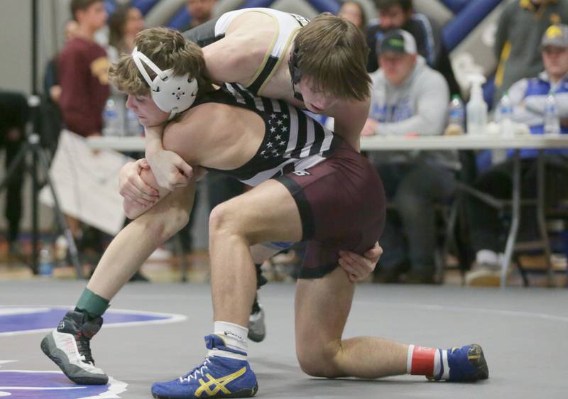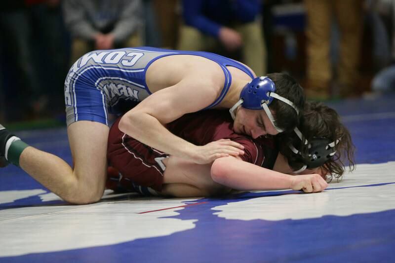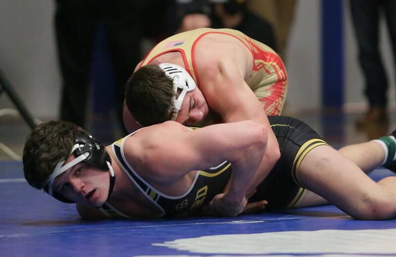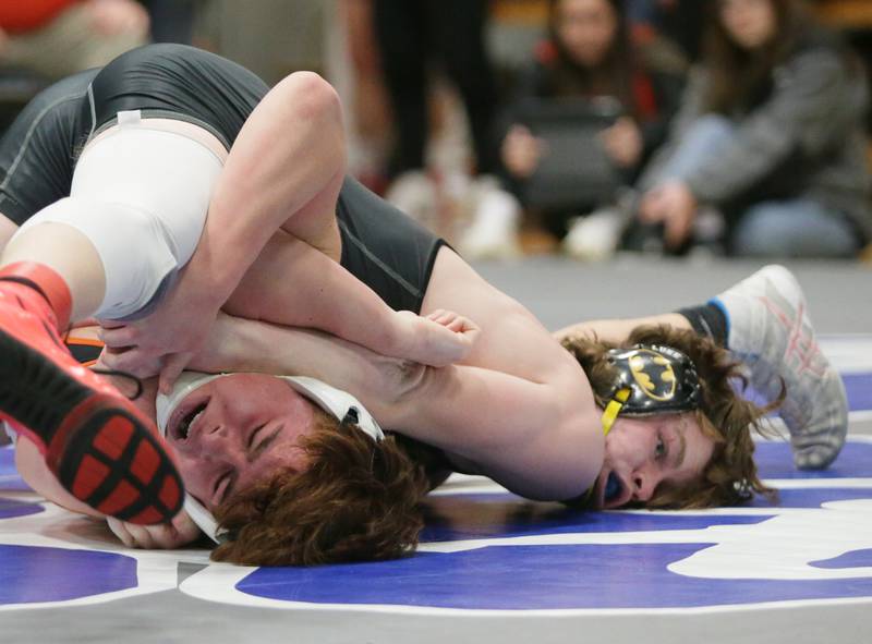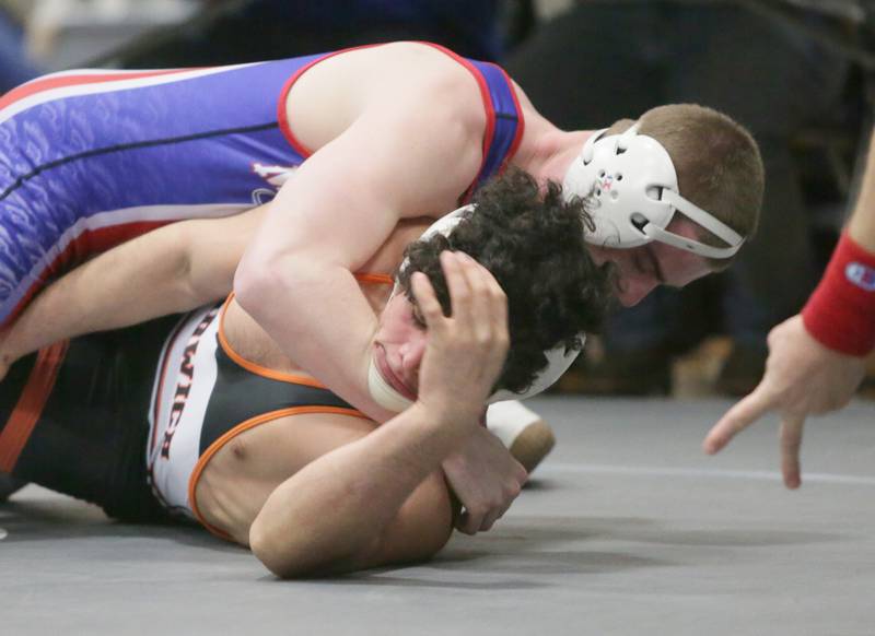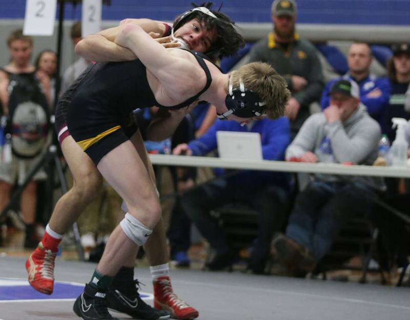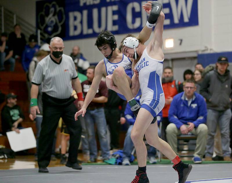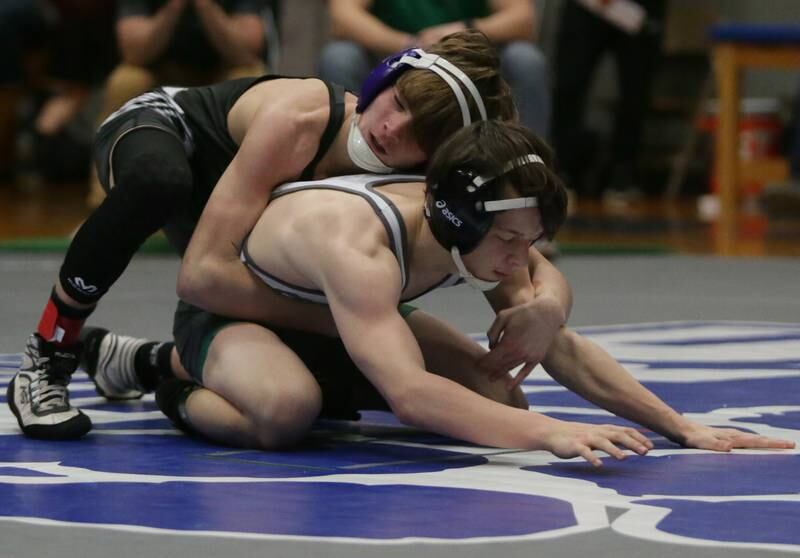 Princeton's Ace Christiansen, wrestles Newman's Brady Grennan, in the 120 weight class at the Class 1A wrestling Sectional meet on Saturday Feb. 12, 2022 in Princeton (Scott Anderson)