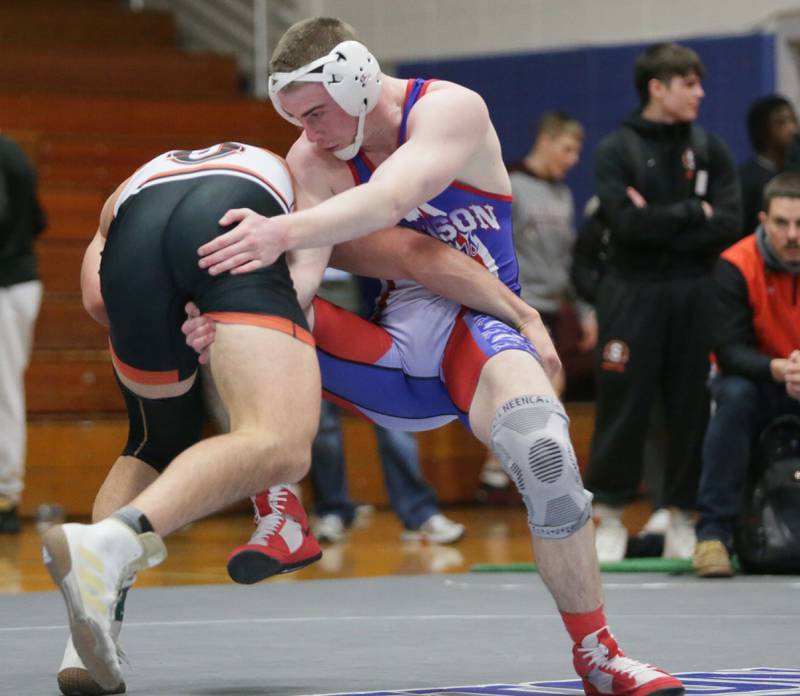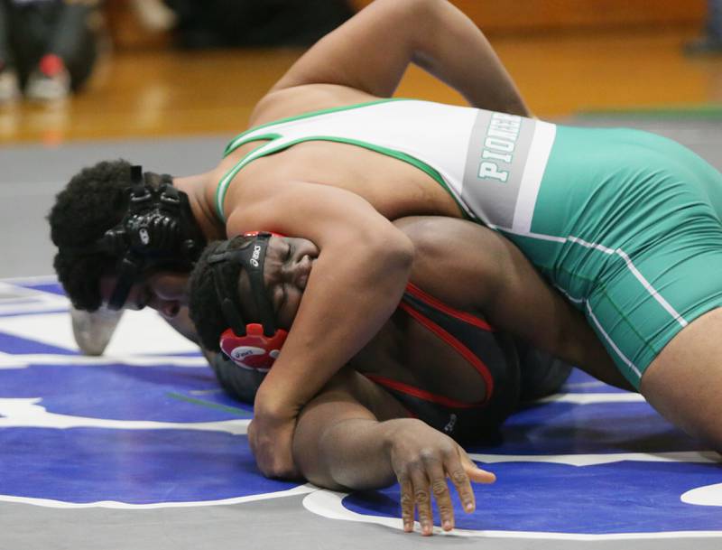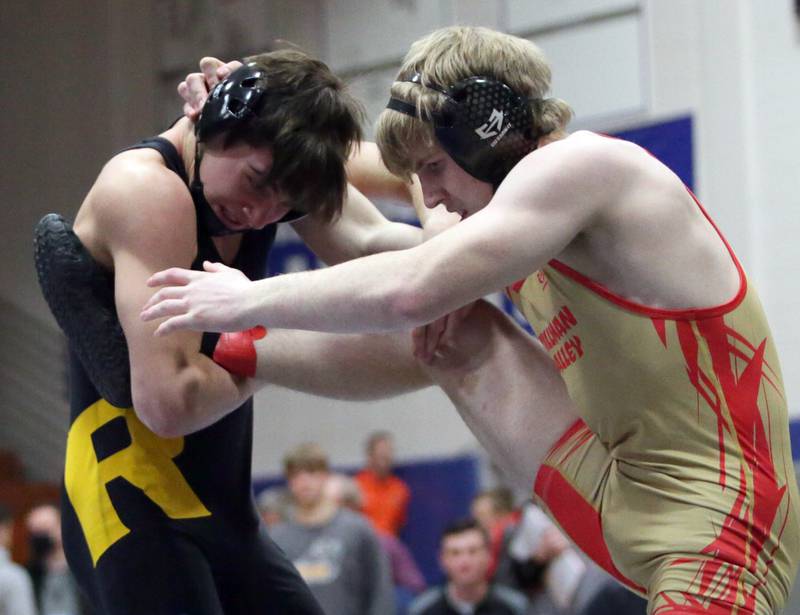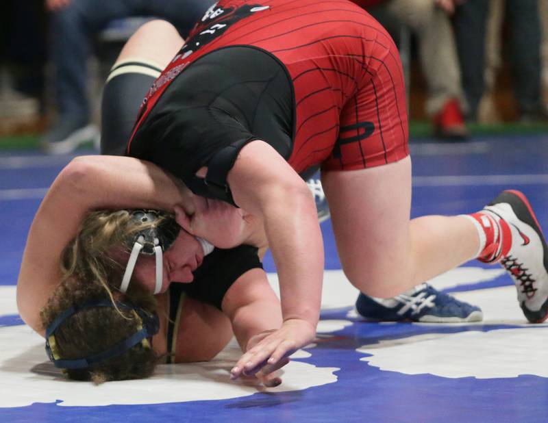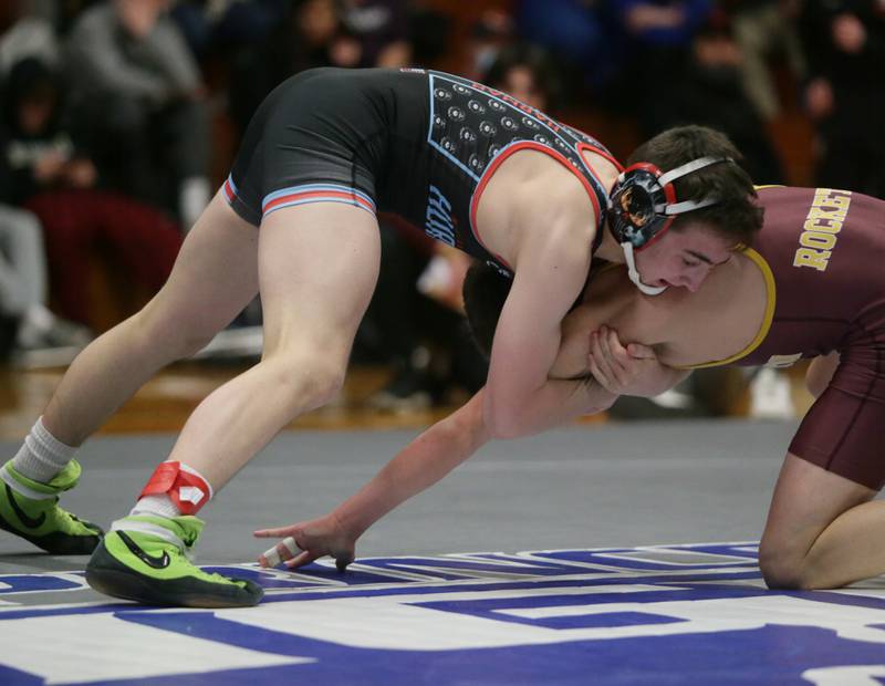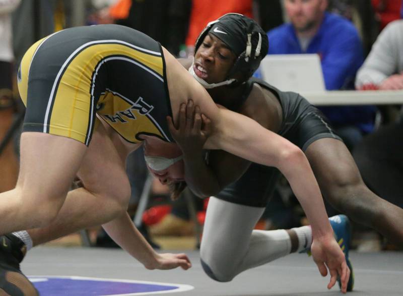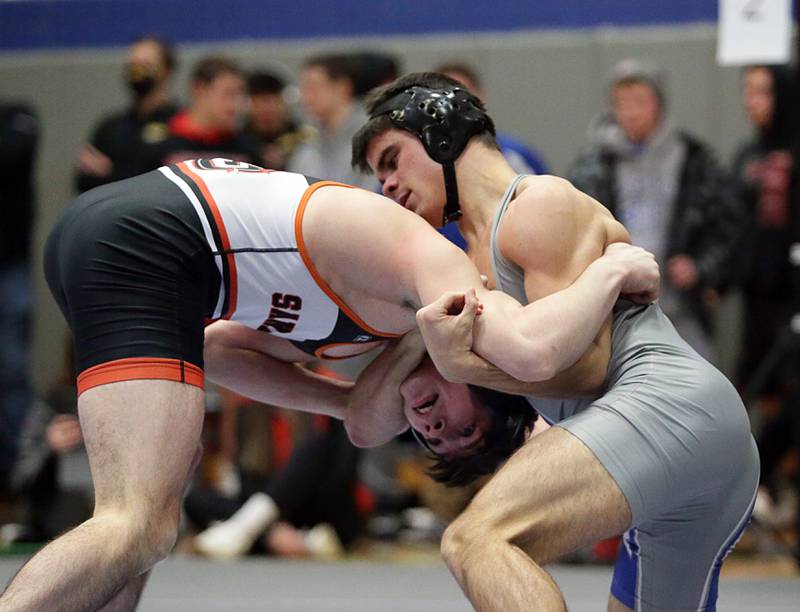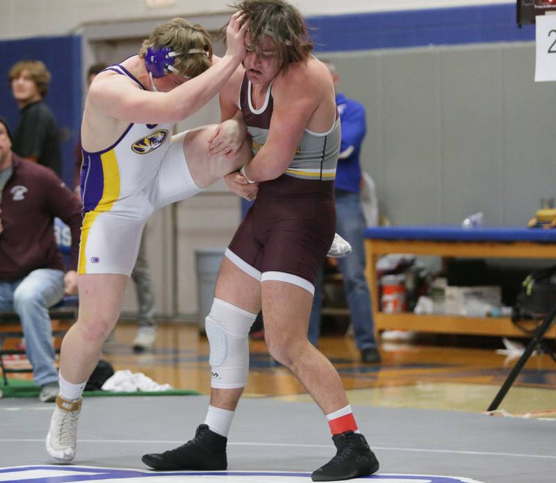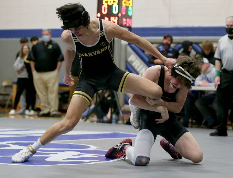 Princeton's Ace Christiansen, wrestles Newman's Brady Grennan, in the 120 weight class at the Class 1A wrestling Sectional meet on Saturday Feb. 12, 2022 in Princeton (Scott Anderson)