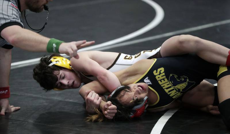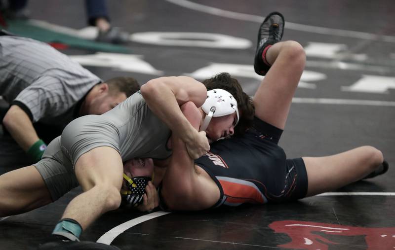 Huntley’s Sam Henkle wrestles Prospect’s Will Baysingar at 132-pounds during the IHSA 3A Individual Sectional wrestling meet at Barrington High School Saturday February 12, 2022. (Brian Hill/Brian Hill/Daily Herald)