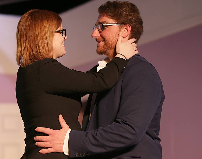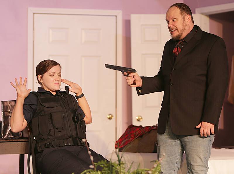 Agent Frank, played by Michael Lee, Officer Billie Dwyer, played by Christin Mitchell and Todd, played by Brian Steep, act out a scene in Unnecessary Farce at Stage 212 on Tuesday, April 12, 2022 downtown La Salle. (Scott Anderson)