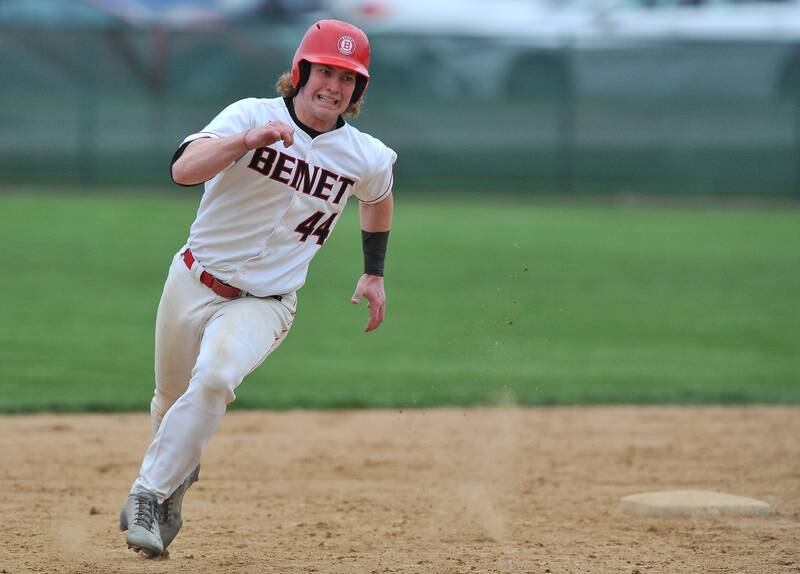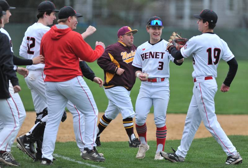 Benet closer Luke Bremner (19) is greeted by teammate Cole Rosenthal (3) and others after retiring Montini in the seventh inning to secure the win on Apr. 28, 2022 at Benet Academy in Lisle. (Jon Cunningham for Shaw Local )