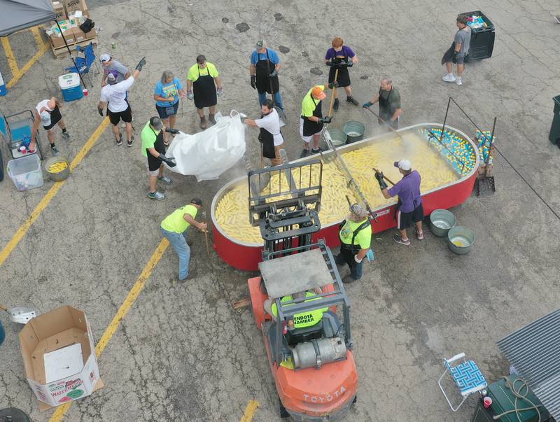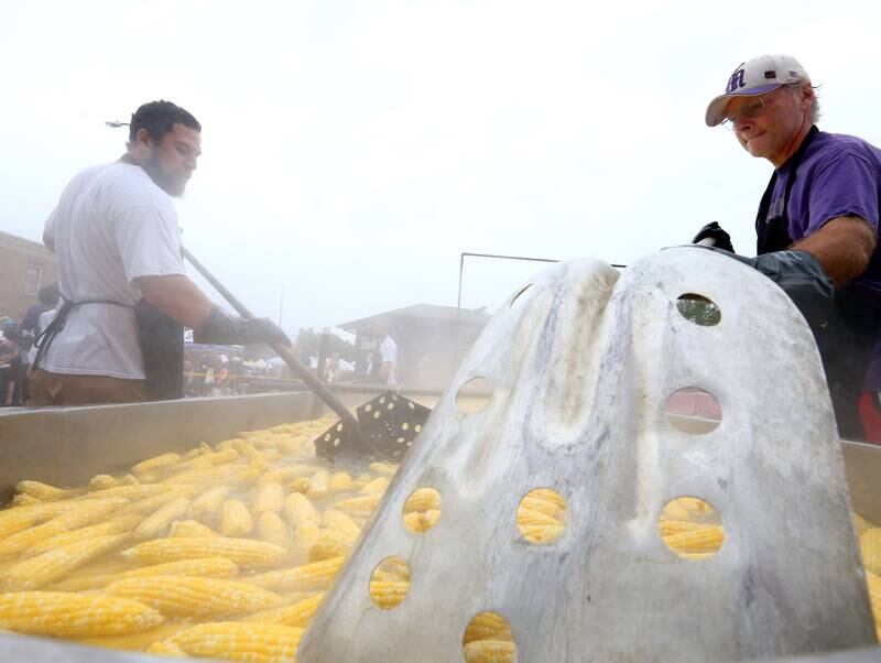 Payton Lumzy and Ryan Blumhorst stir a large steam cauldron full of sweet corn Sunday, Aug. 14, 2022, during the 75th annual Sweet Corn Festival in Mendota. (Scott Anderson - sanderson@shawmedia.com)