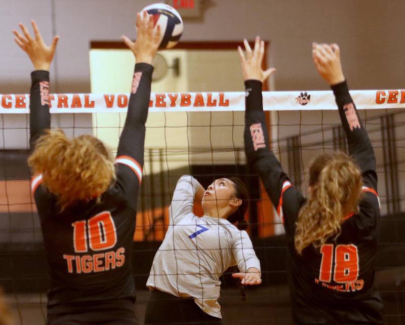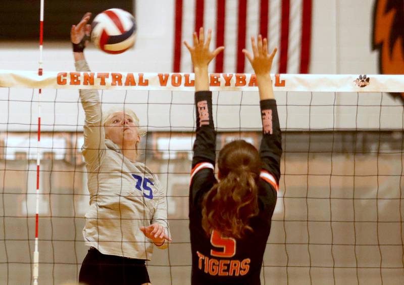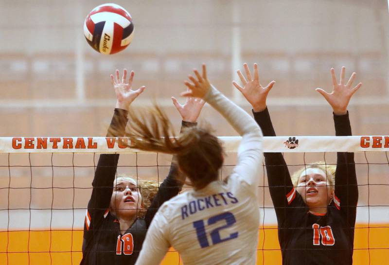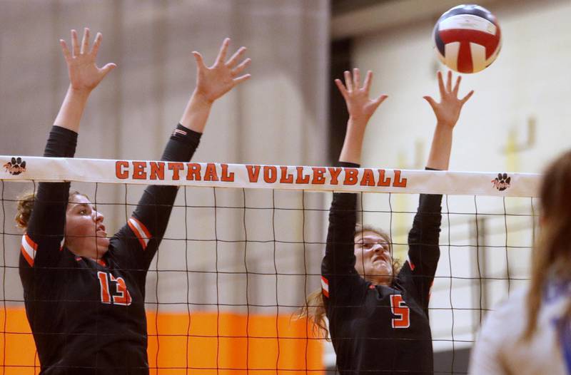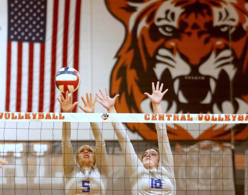Crystal Lake Central’s Siena Smiejek, left, and Mykaela Wallen block against Burlington Central in girls volleyball Tuesday night in Crystal Lake.