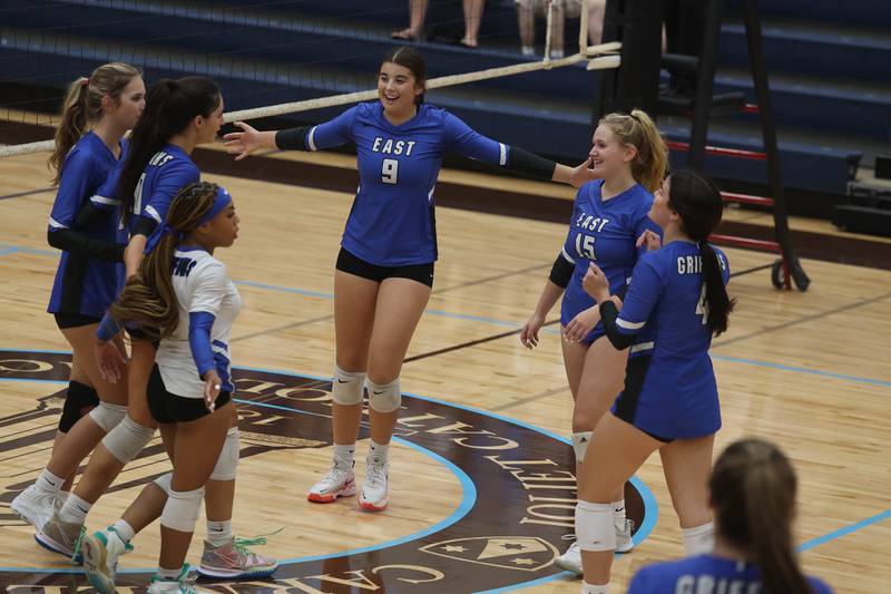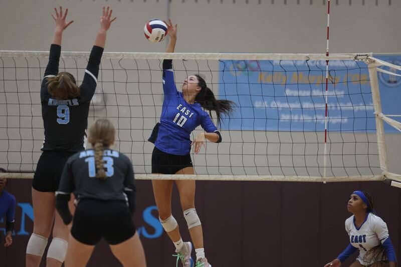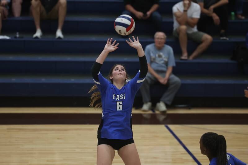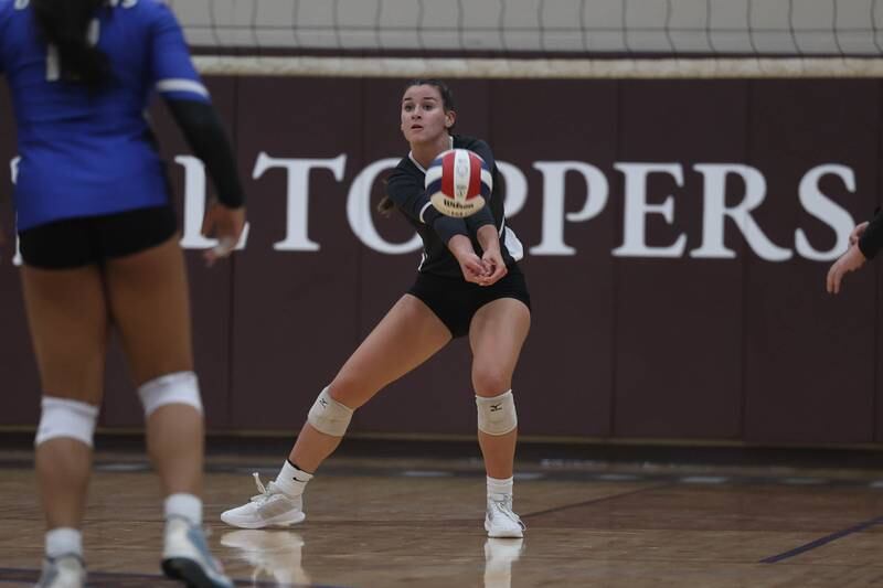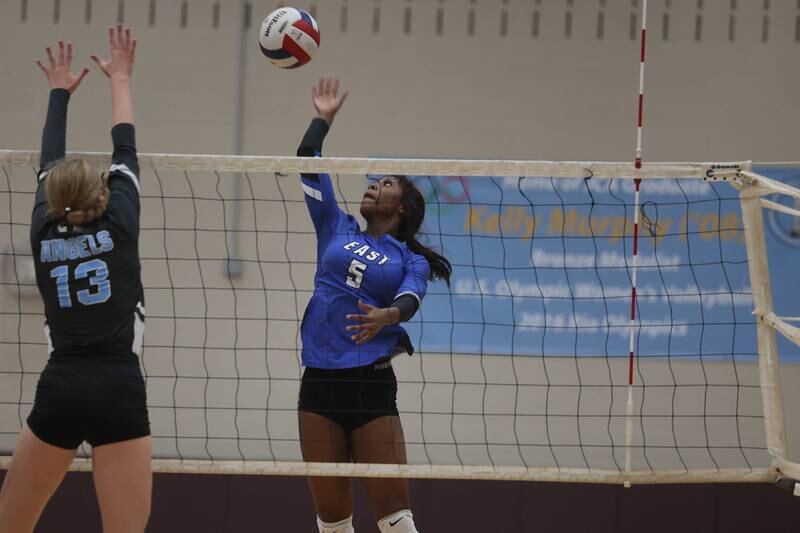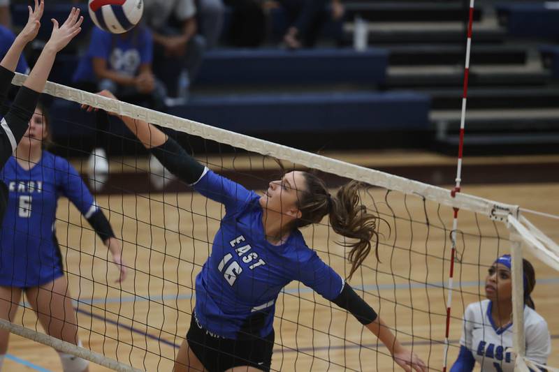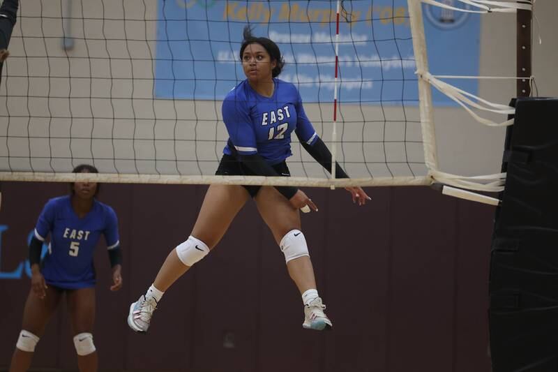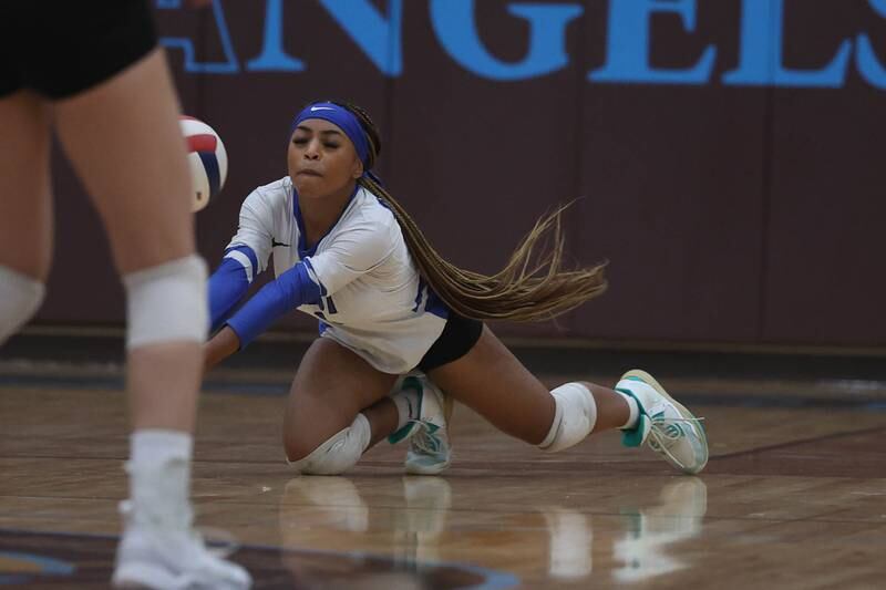 Lincoln-Way East’s Lexi Byas dives for the dig against Joliet Catholic. Monday, Sept. 19, 2022, in Joliet. (Gary Middendorf - gmiddendorf@shawmedia.com/Gary Middendorf)